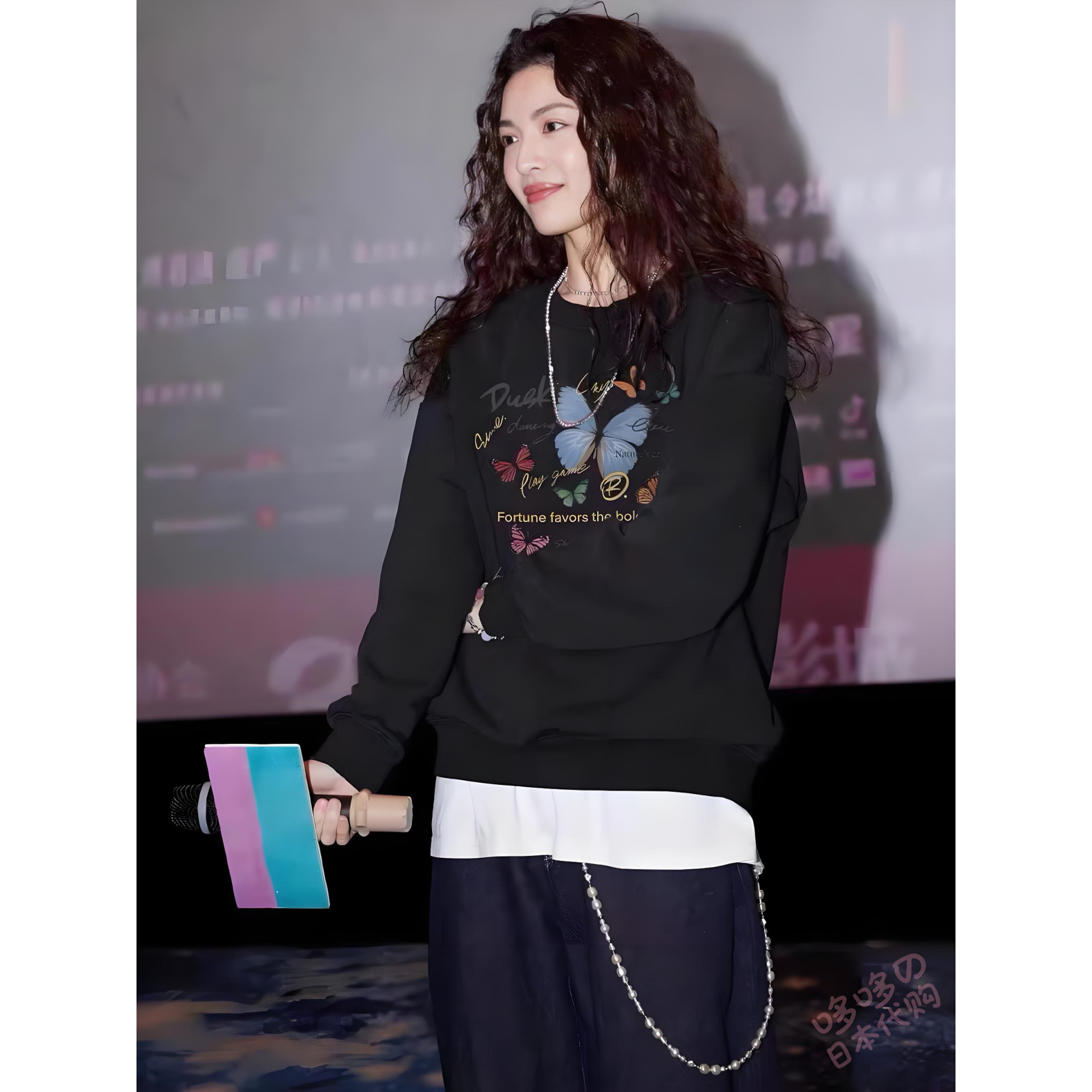 日本代购潮牌倪妮同款黑色圆领卫衣女秋冬加绒加厚宽松设计感上衣 - 哆哆日本代购