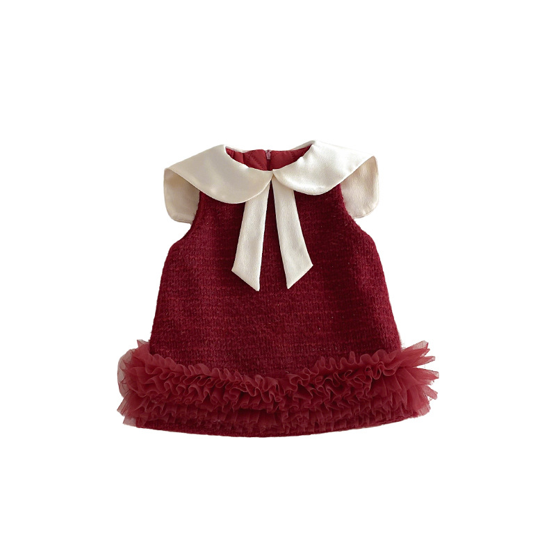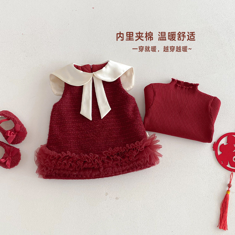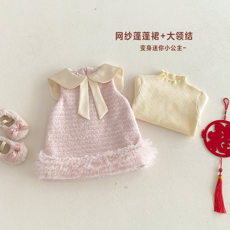您的位置:他他商城  >   >  女童小香风拜年服冬装新款宝宝娃娃领夹棉裙子女孩网纱无袖连衣裙