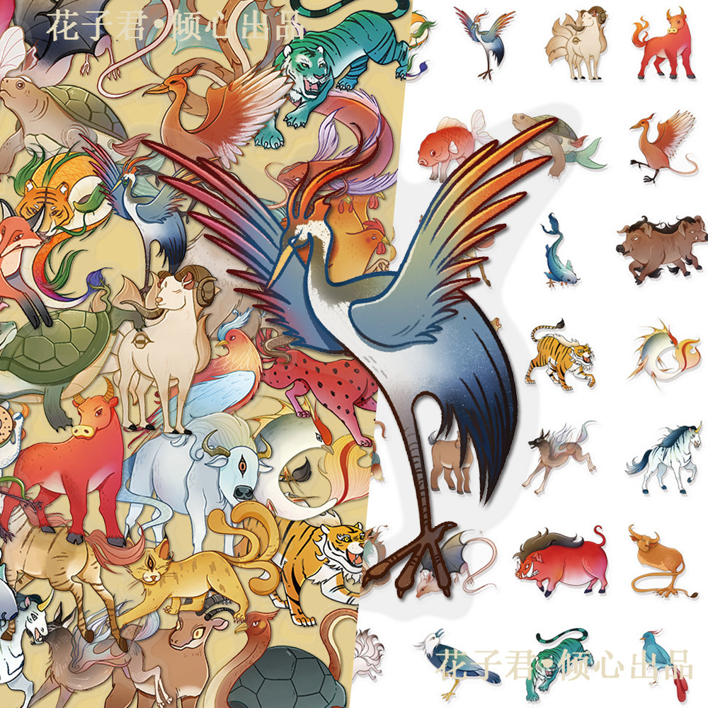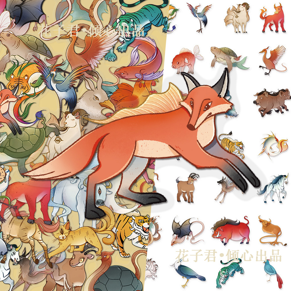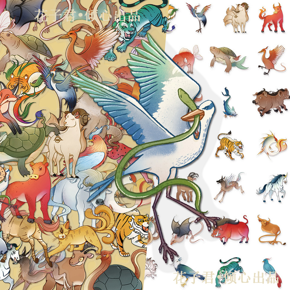 100张山海经动物PET贴纸国风创意彩绘动物插画diy手账笔记本 - 零零贴纸世界