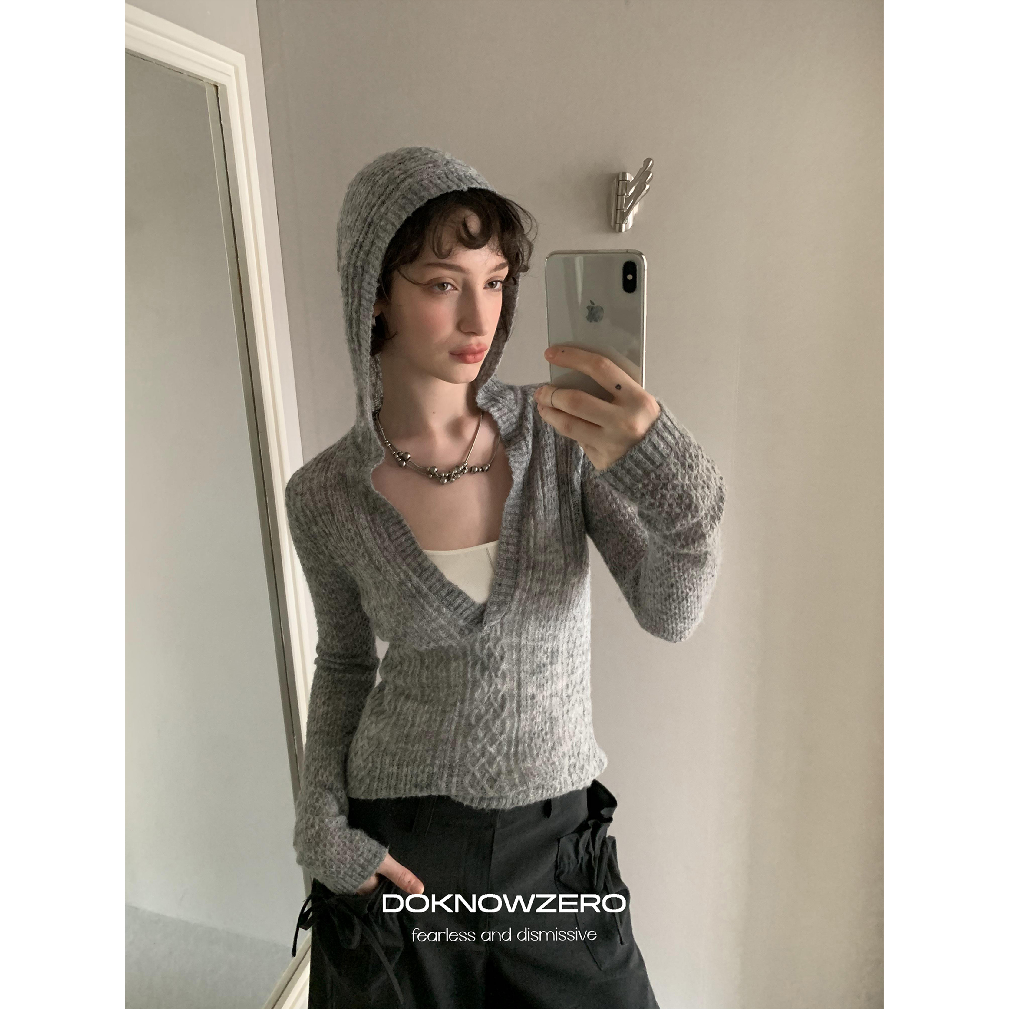 DKZ 深v领连帽针织衫女秋季新款修身薄款叠搭上衣 - DKZ OFFICIAL