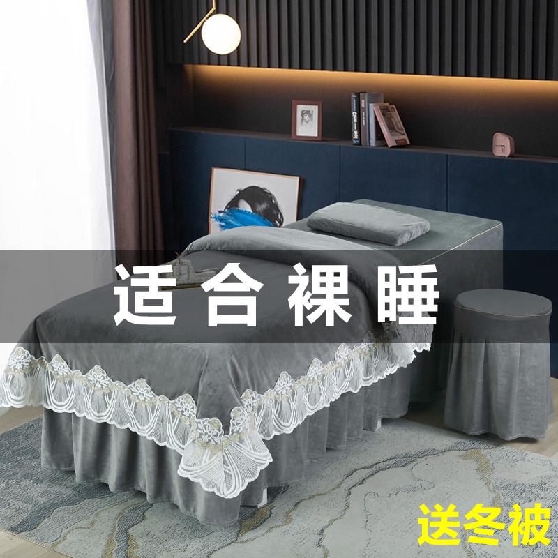 水晶绒美容床罩四件套新款冬季珊瑚绒高档美容院专用按摩床套带洞