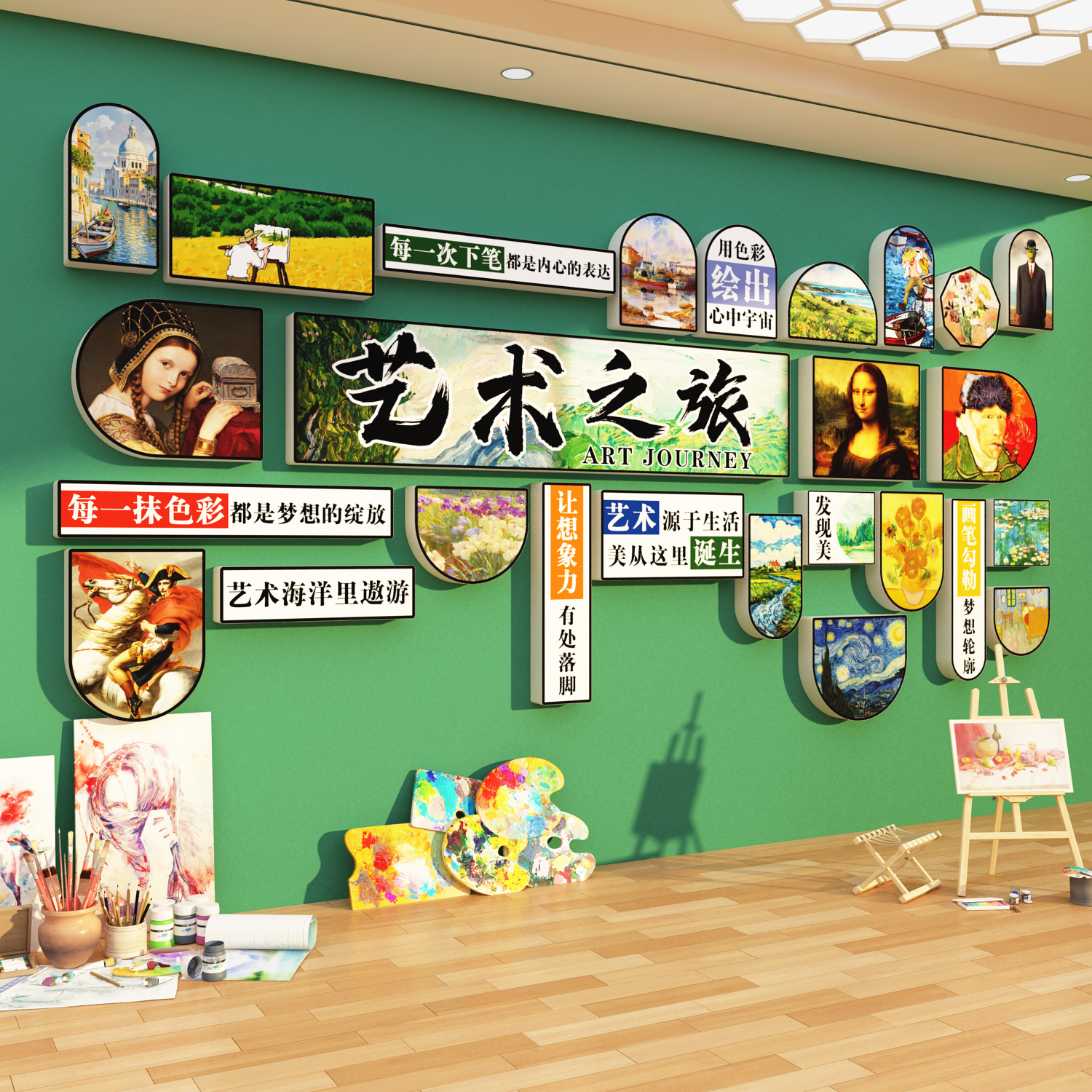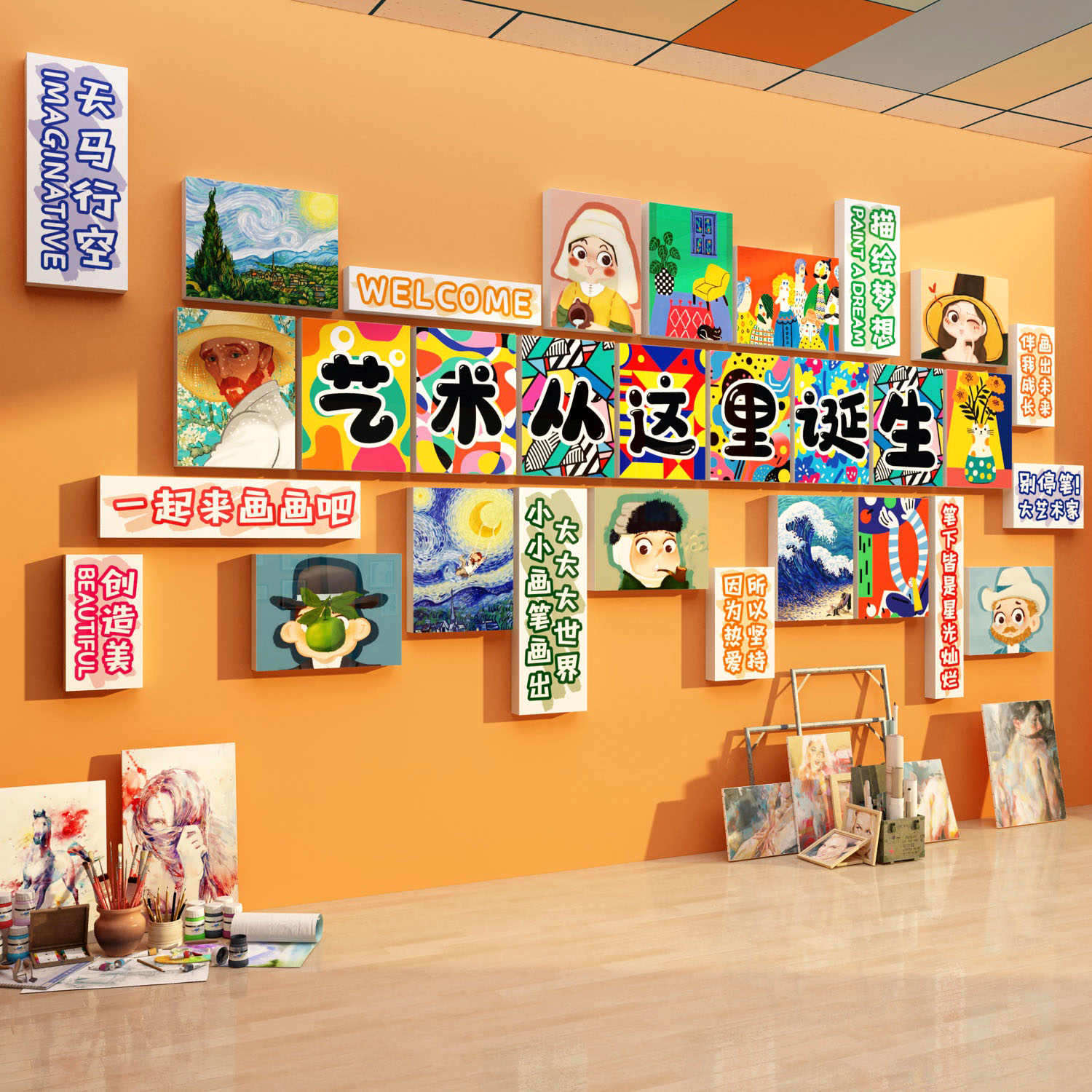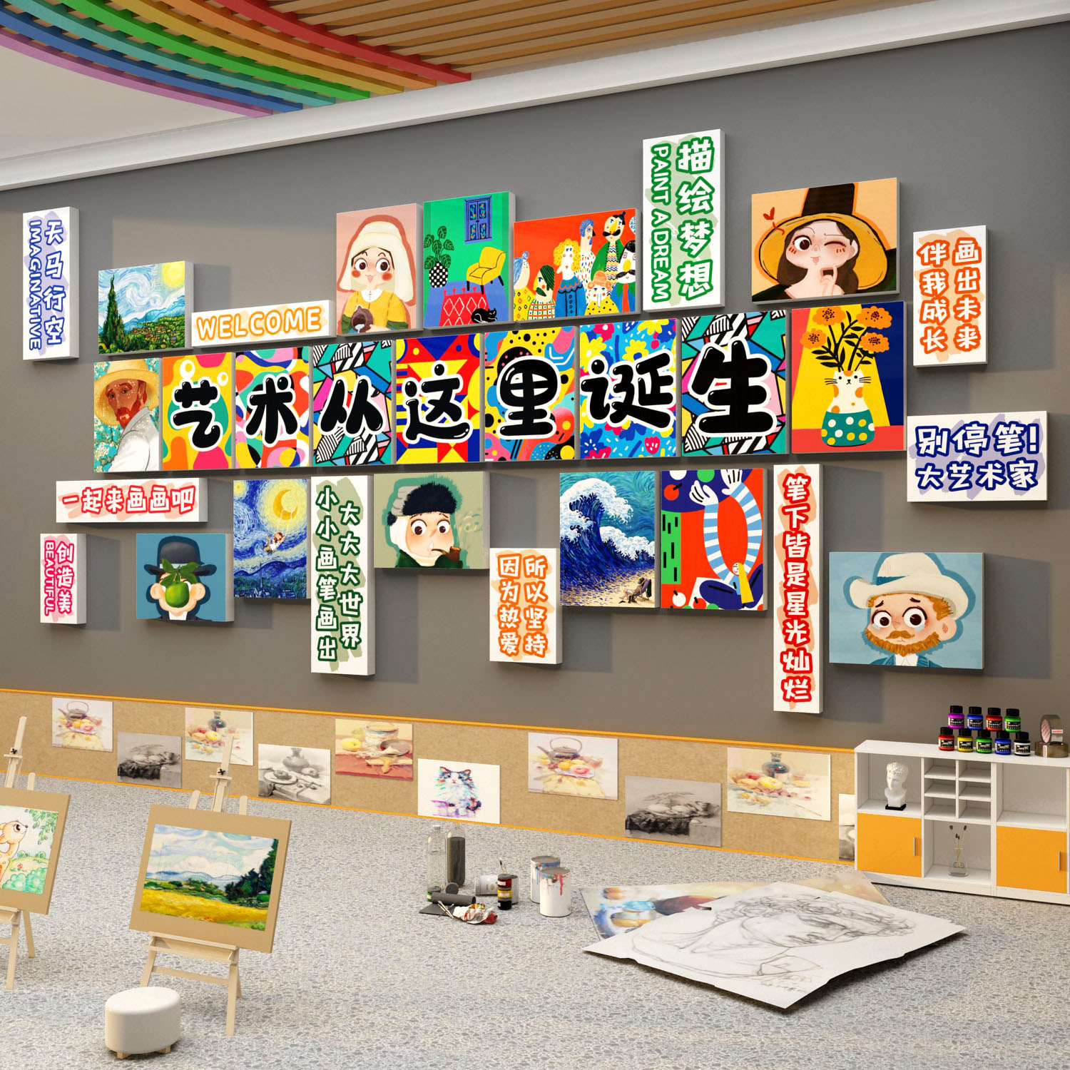 美术教室布置装饰画室氛围布置机构幼儿园环创主题墙面成品作展示