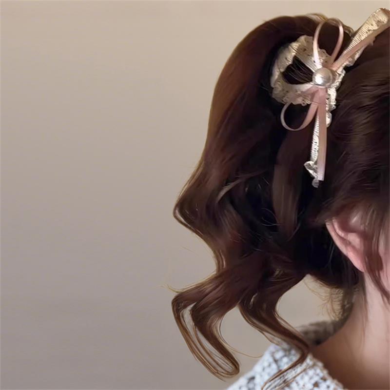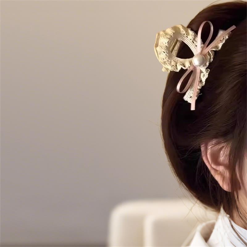 质感仿贝珍珠丝带蝴蝶结蕾丝发夹甜美后脑勺抓夹超仙头饰发饰女 - 九尾SAY