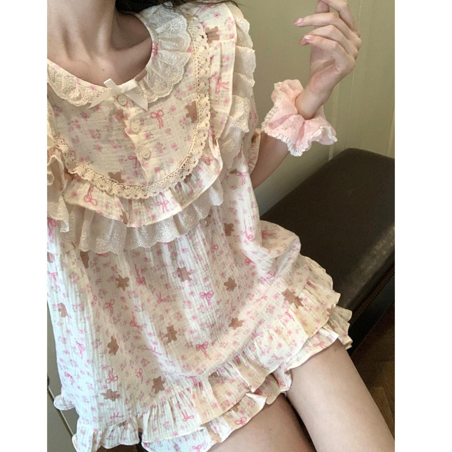 宫廷风甜美花边小熊碎花睡衣女款夏季短袖短裤纯棉纱布家居服套装 - 西岭百货官营店