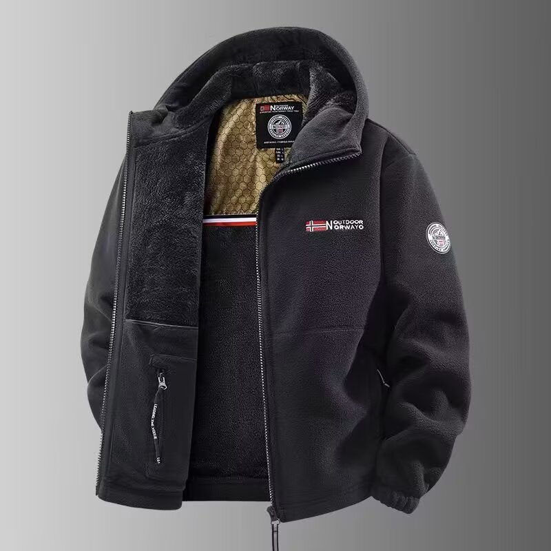 时尚保暖抗寒加绒加厚连帽上衣男冬季户外休闲摇粒绒开衫夹克外套
