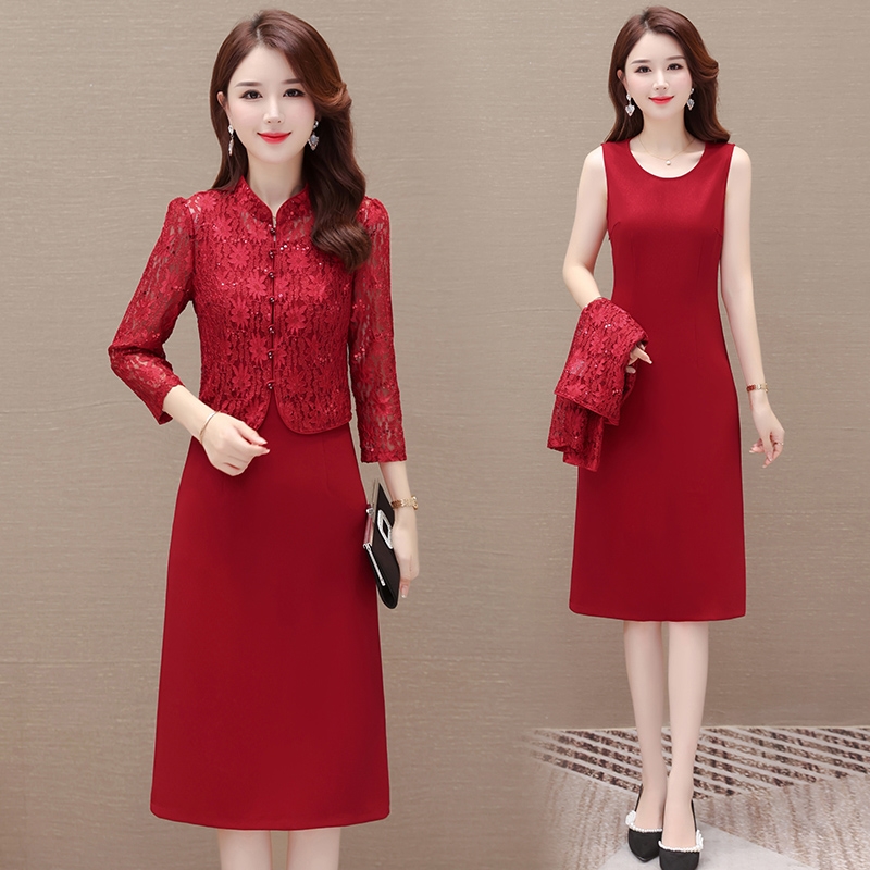 喜婆婆妈妈婚宴红色裙子2025新款秋季女改良两件套蕾丝旗袍连衣裙