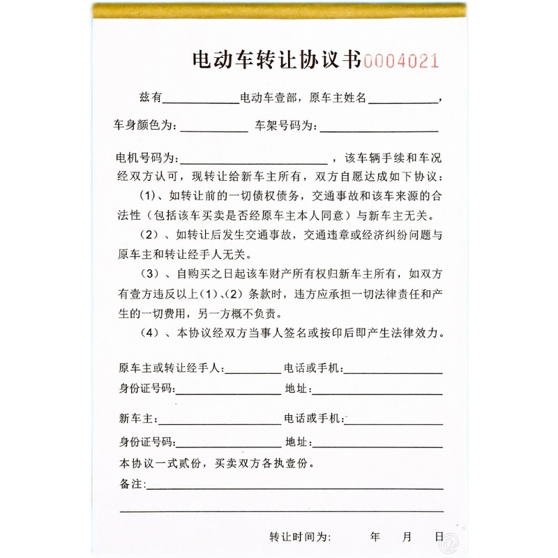 通用简单电动车转让协议书二联旧电瓶车交易买卖合同购车凭证定制 - 百样印刷