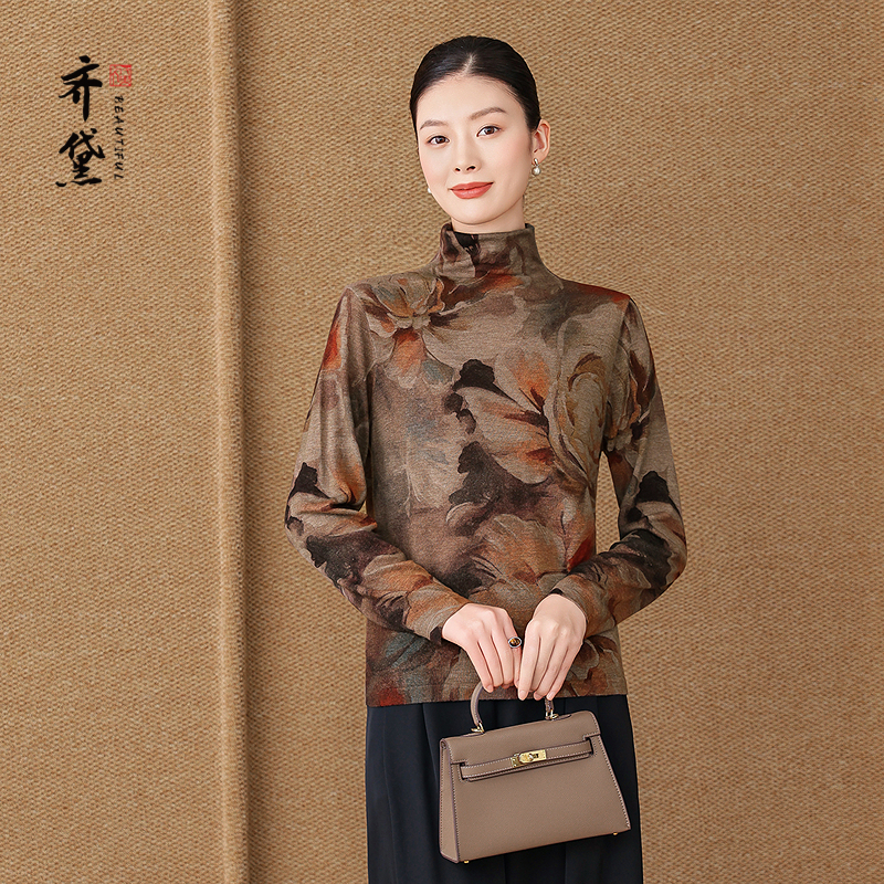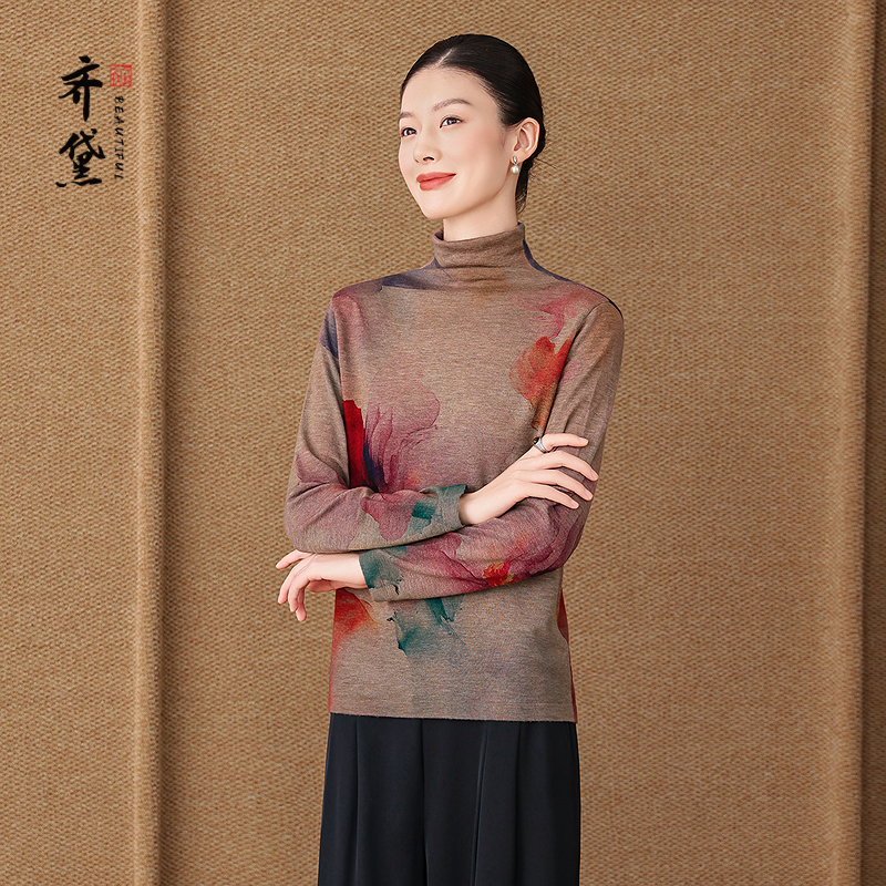 齐黛品牌羊毛长袖打底衫女可外穿2025新款高领印花显瘦内搭针织衫 - 齐黛真丝