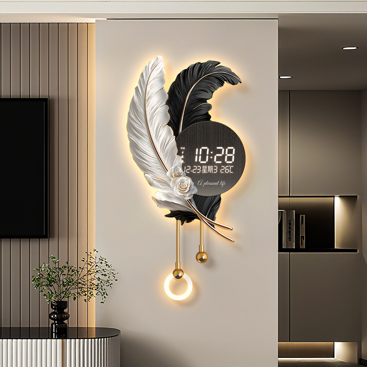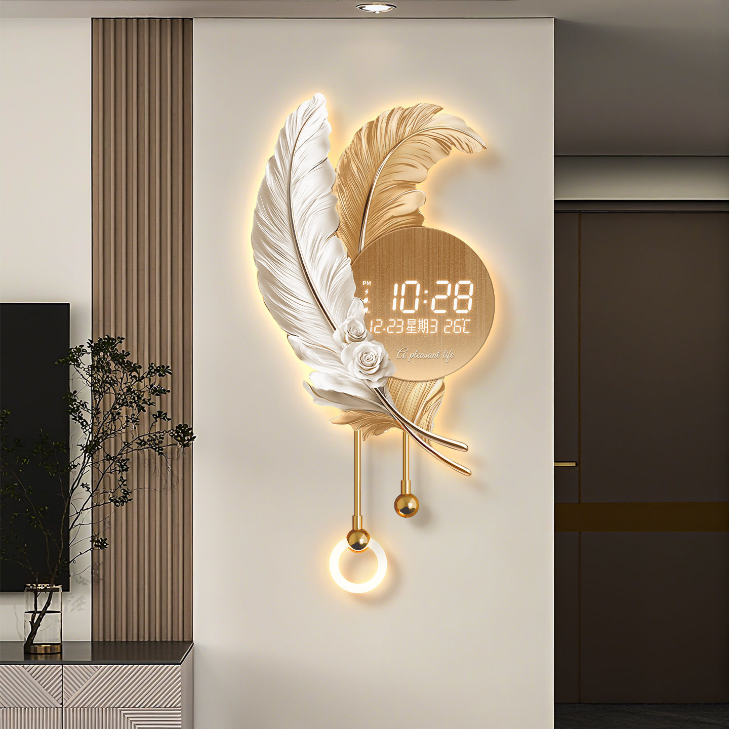 羽毛格栅装饰挂件客厅挂钟万年历电子表挂墙高级轻奢创意时钟壁灯 - 潮优贝家居旗舰店