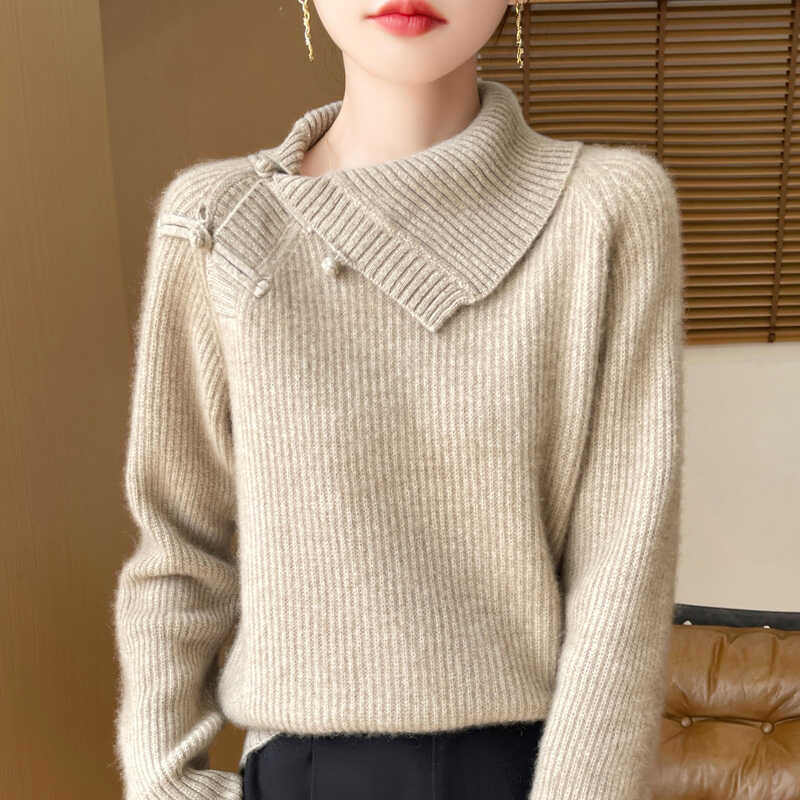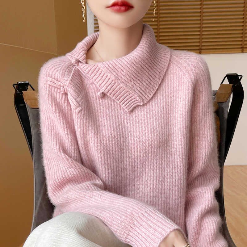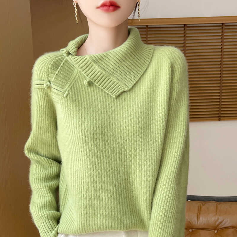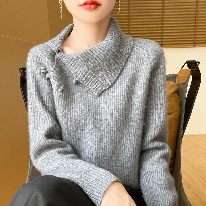 复古国风新中式100%纯羊毛衫女侧翻领盘扣针织毛衣宽松加厚羊绒衫 - 梦茜韵高端羊绒衫工厂直销店