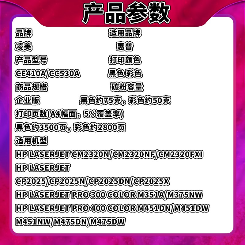 您的位置:他他商城  >  文体  >  适用惠普M451dn硒鼓CP2025 CC530A cm2320M375NWHP300 M351A M476