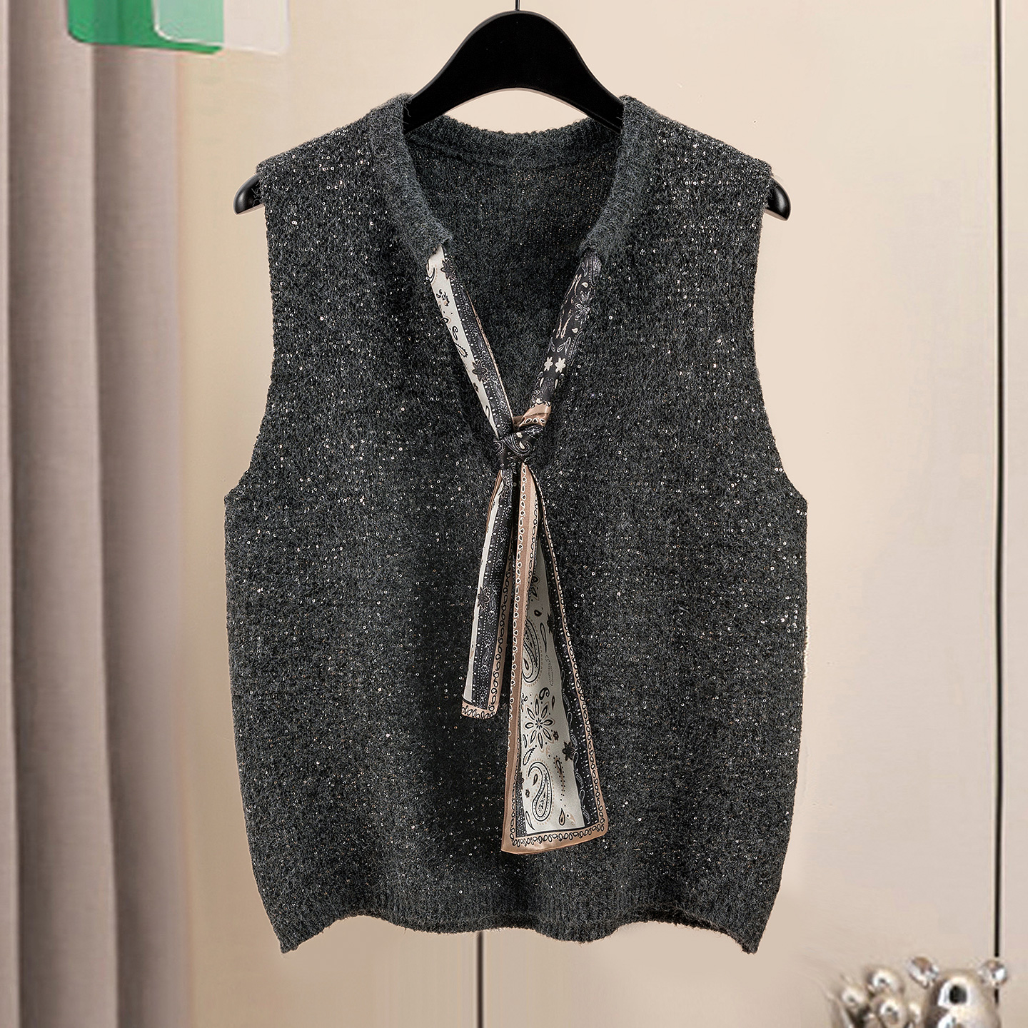 她池宽松款马夹2025秋装新款女装设计感珠片丝巾V领套头叠穿马甲 - 她池旗舰店