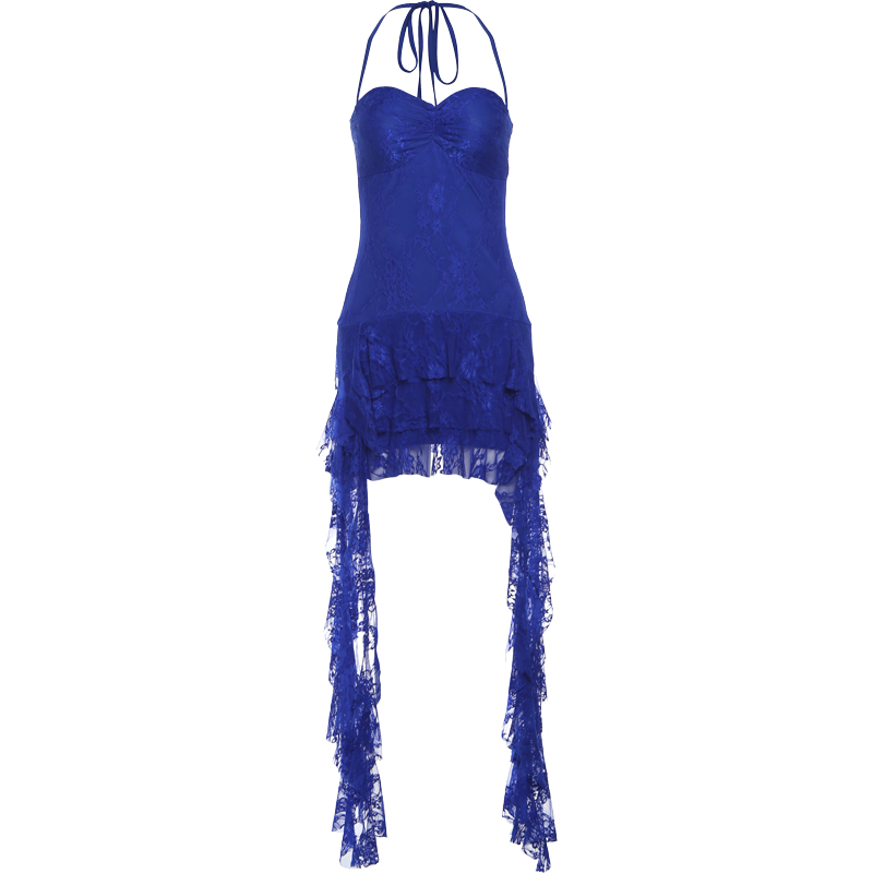怪诞女孩#蓝色妖姬性感蕾丝设计挂脖吊带裙丝带不规则拼接短裙女