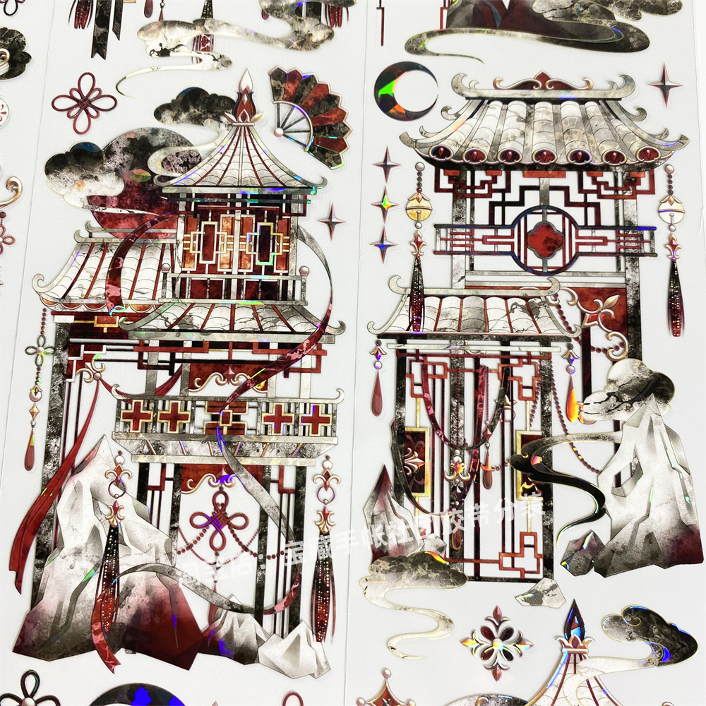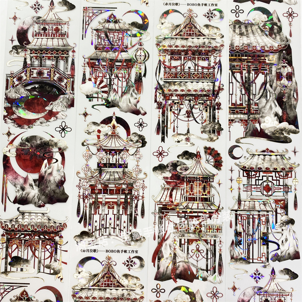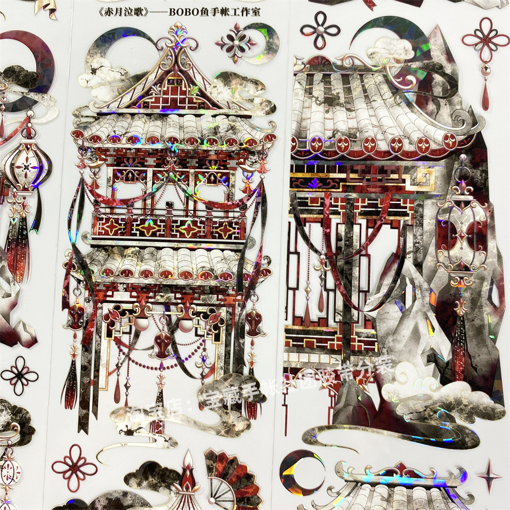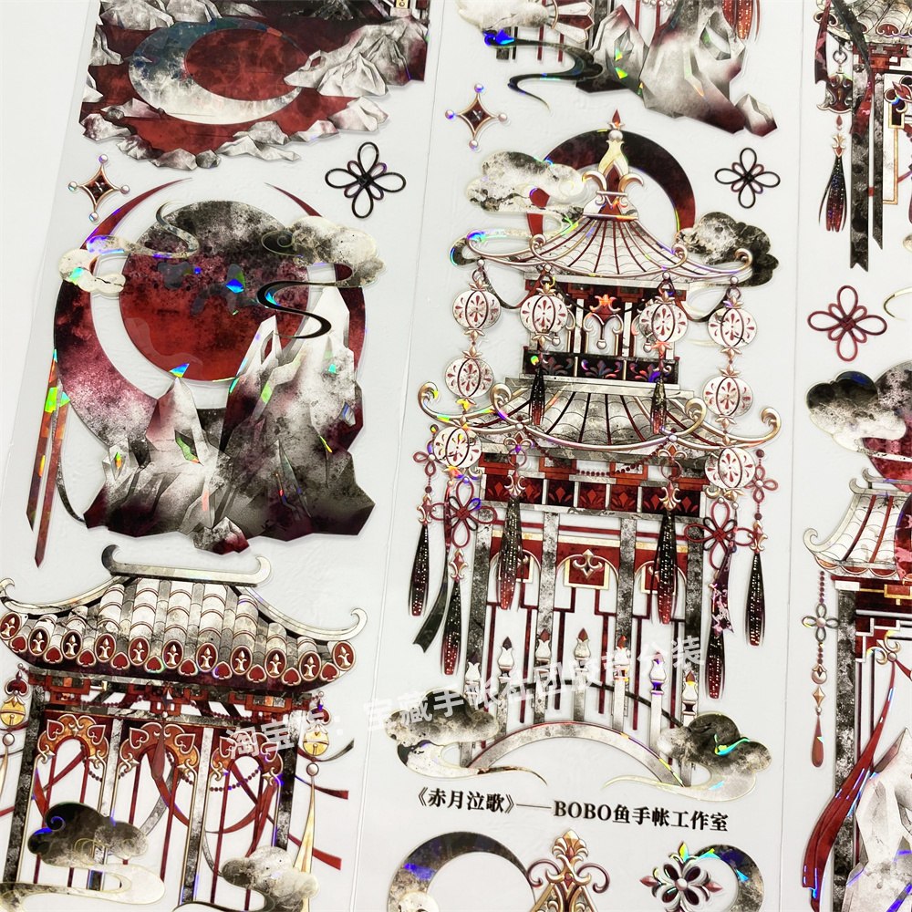 手帐分装胶带r89赤月泣歌BoBo鱼黑红城楼亮PET古风素材账流麻贴纸 - 宝藏手帐社团胶带分装