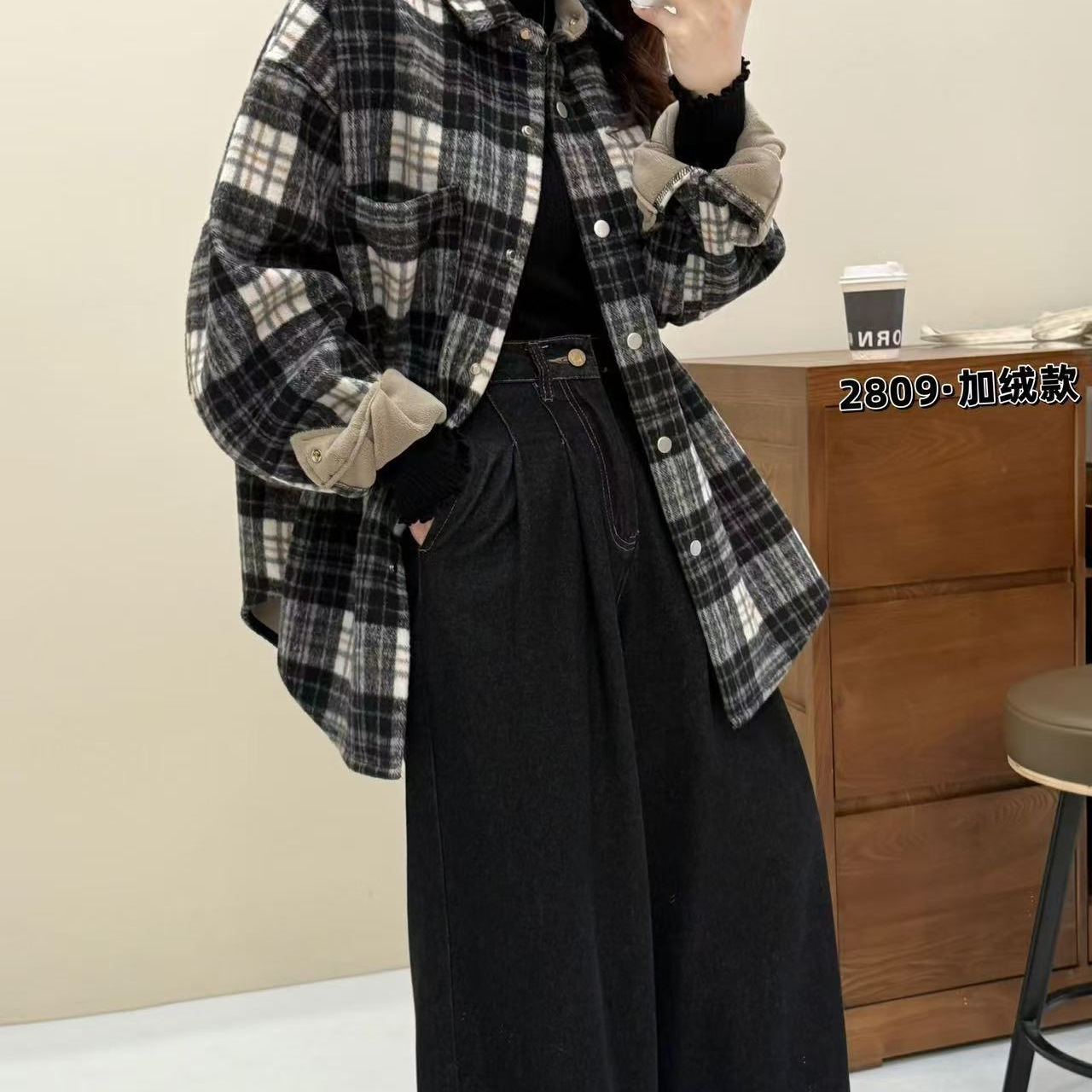 2024冬款衬衫女加绒加厚保暖上衣撞色长袖学院风上衣韩版格子衬衣 - JJ高端设计师品牌店