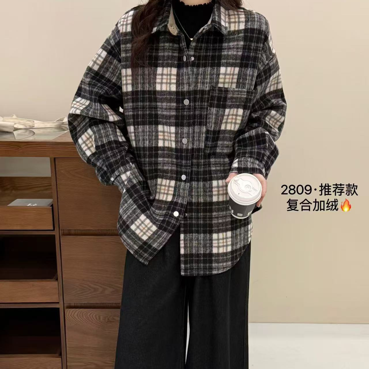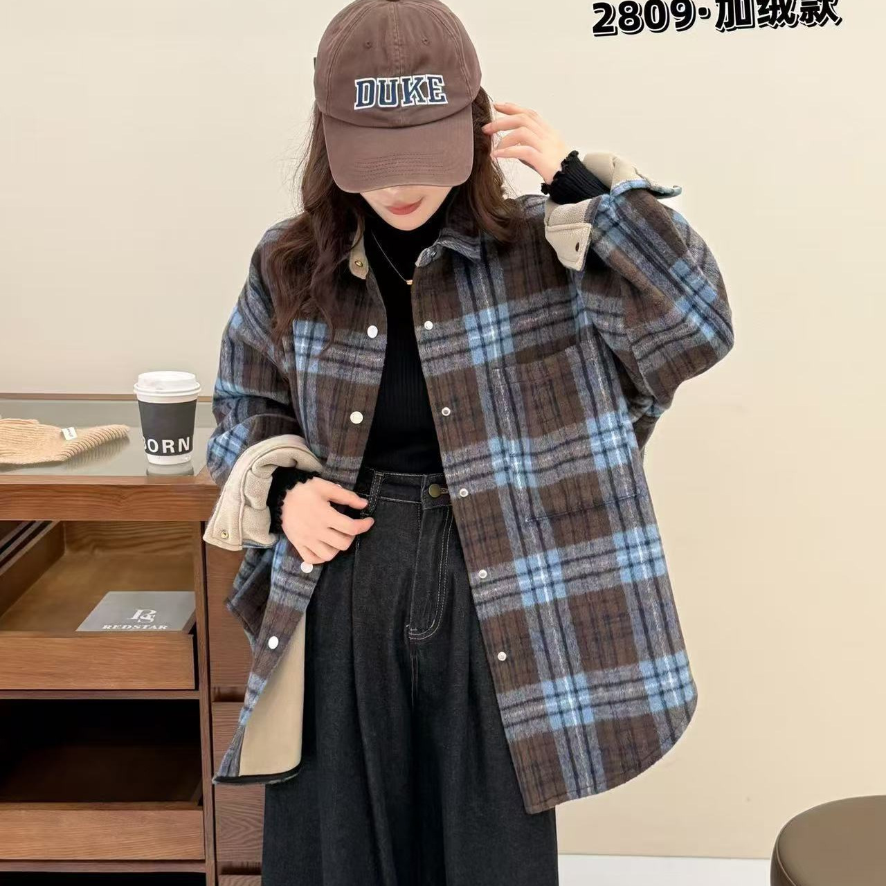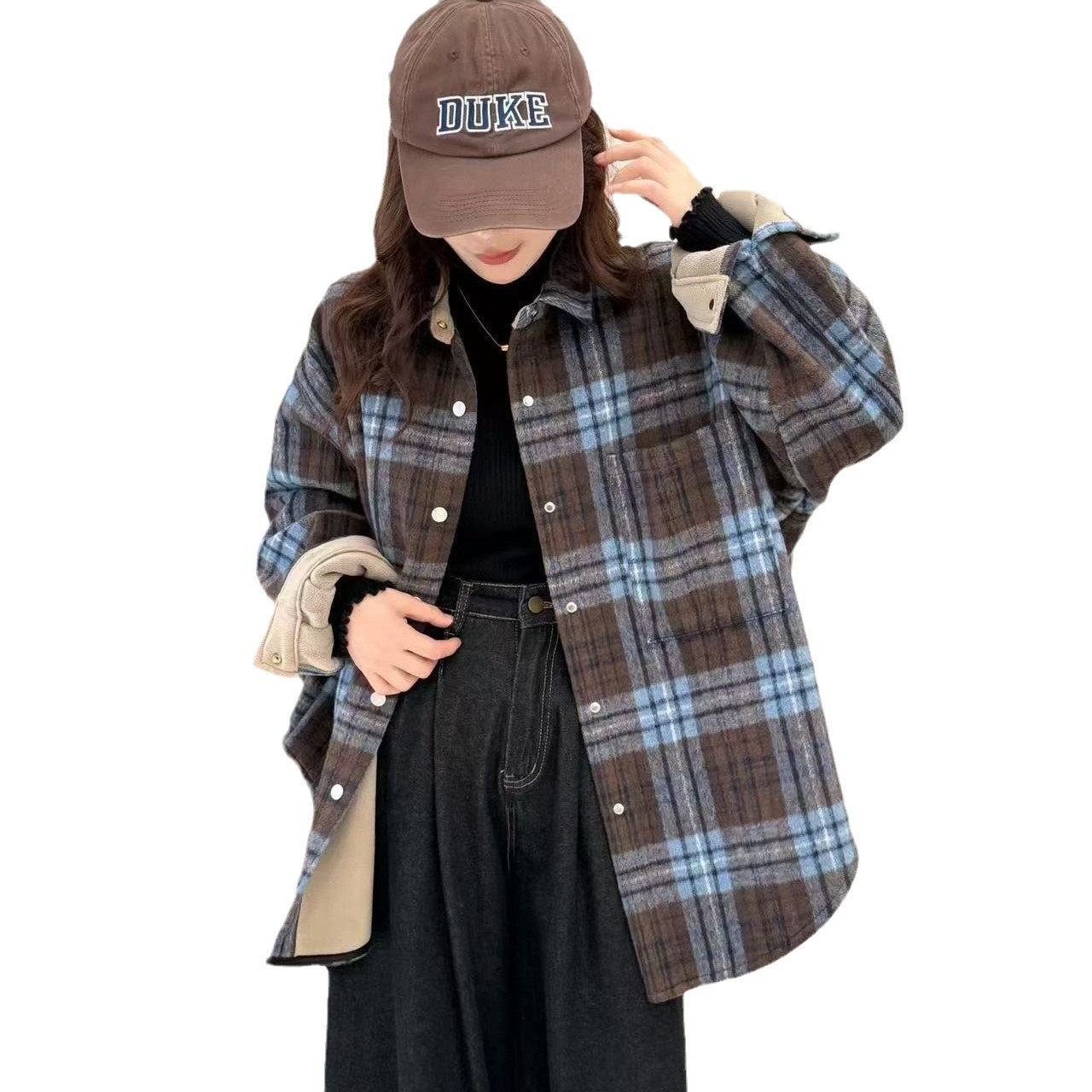 您的位置:他他商城  >   >  2024冬款衬衫女加绒加厚保暖上衣撞色长袖学院风上衣韩版格子衬衣