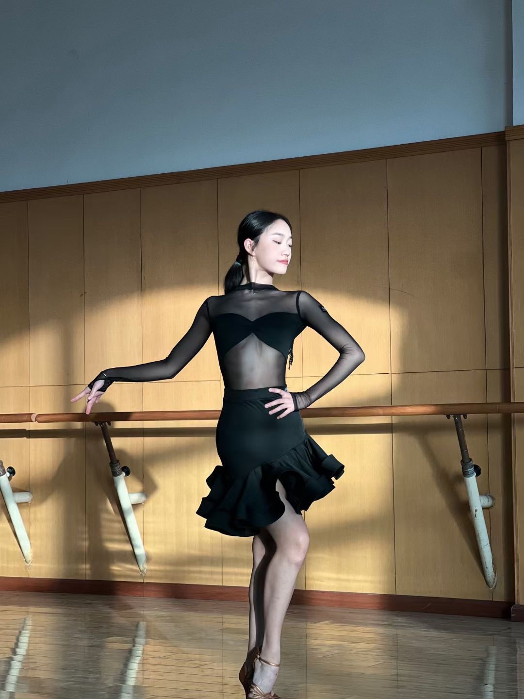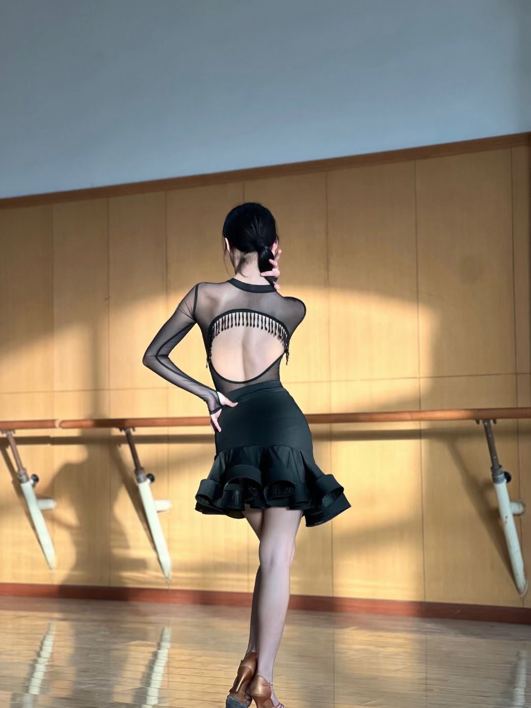 Aurora拉丁舞服长袖网纱上衣露背管珠设计斜边鱼骨裙黑色表演服女