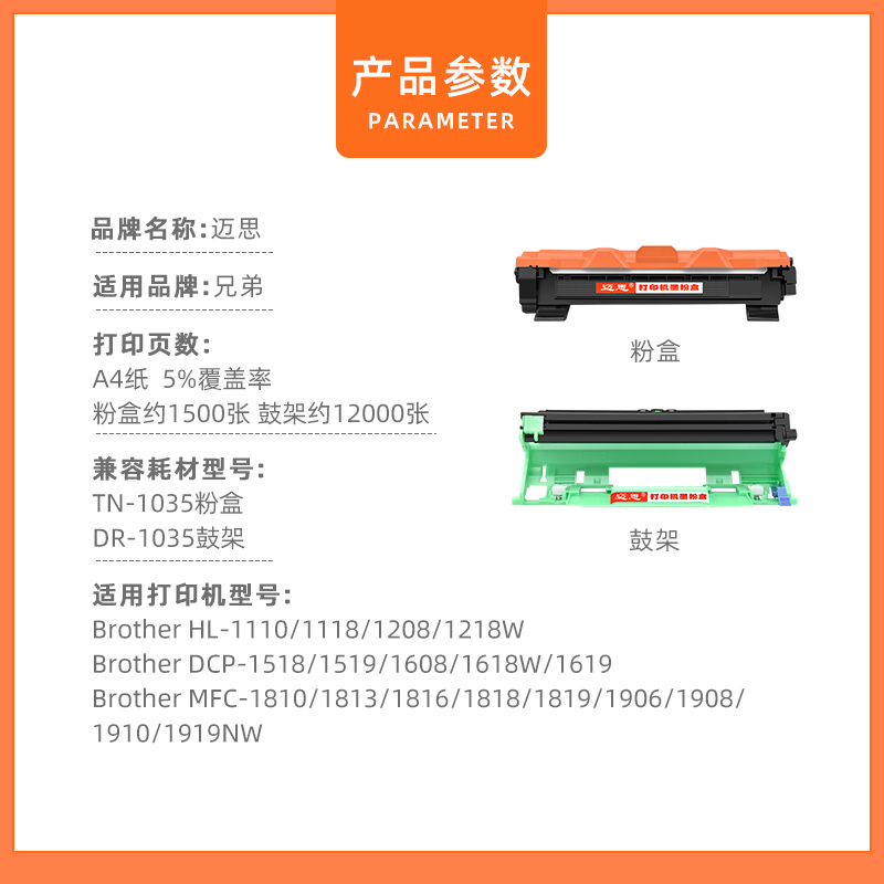 您的位置:他他商城  >   >  适用兄弟TN1035粉盒DCP1608打印机1618W MFC1919NW硒鼓HL1208 DCP