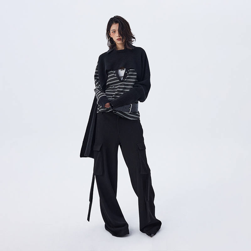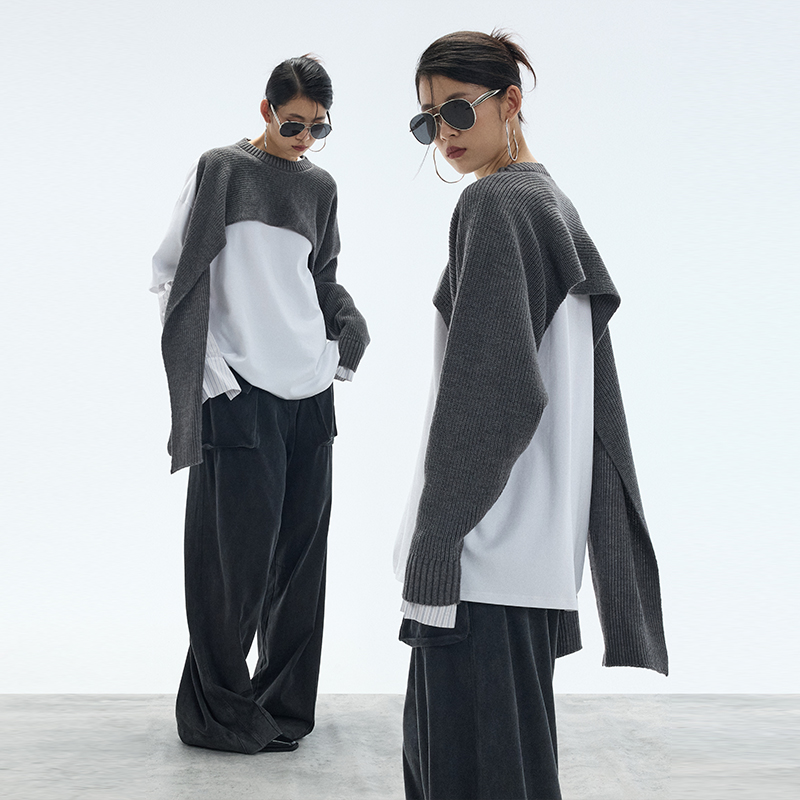 您的位置:他他商城  >   >  ourhour 一只袖 黑灰套头不对称开衩针织披肩 女秋设计感外搭围巾
