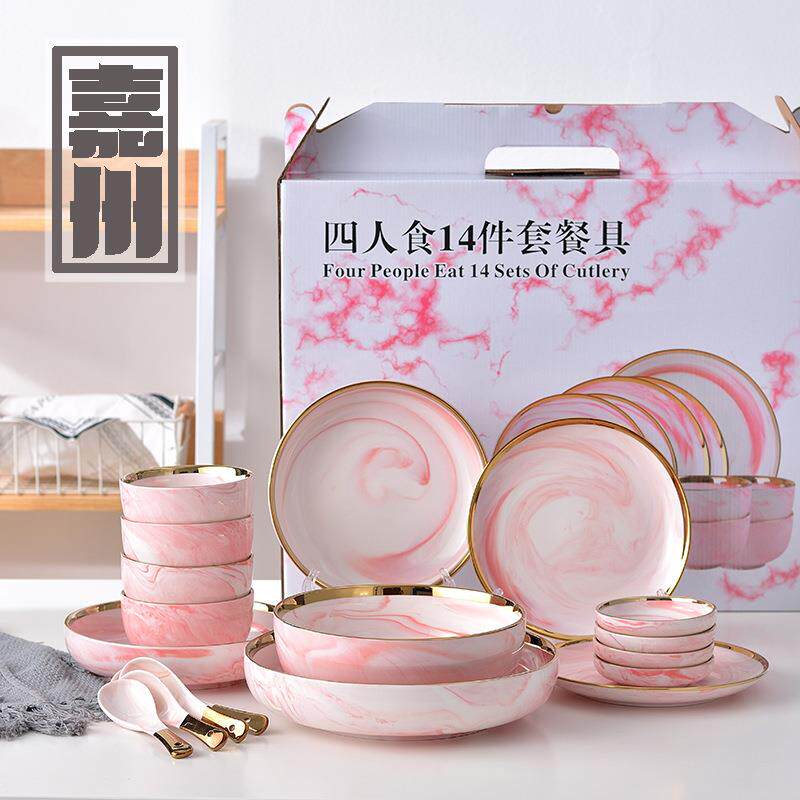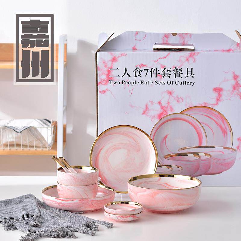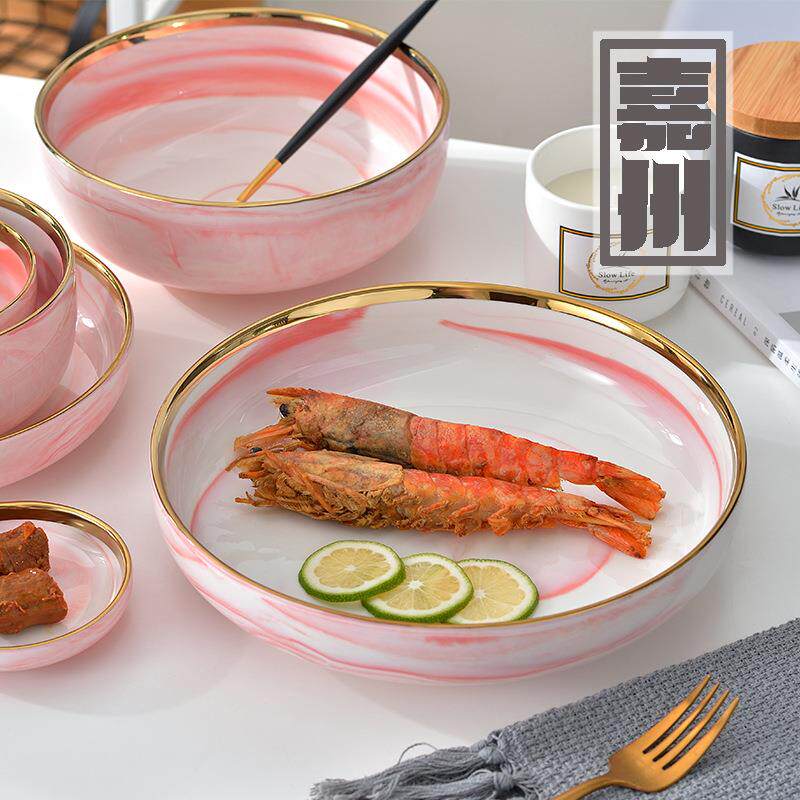 供应大理石纹金边盘粉色套装餐具碗盘碟家用汤碗饭碗嘉州
