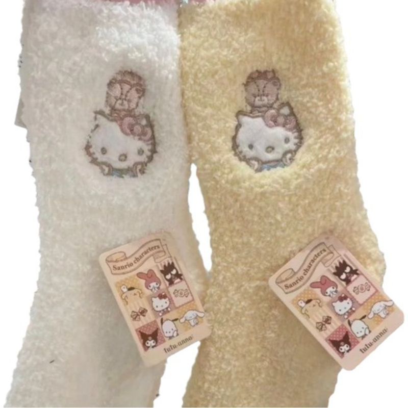 Kt绣花珊瑚丝绒Hello Kitty女士袜小猫中小腿袜2对绒毛袜加厚的限 - 枚高商贸店