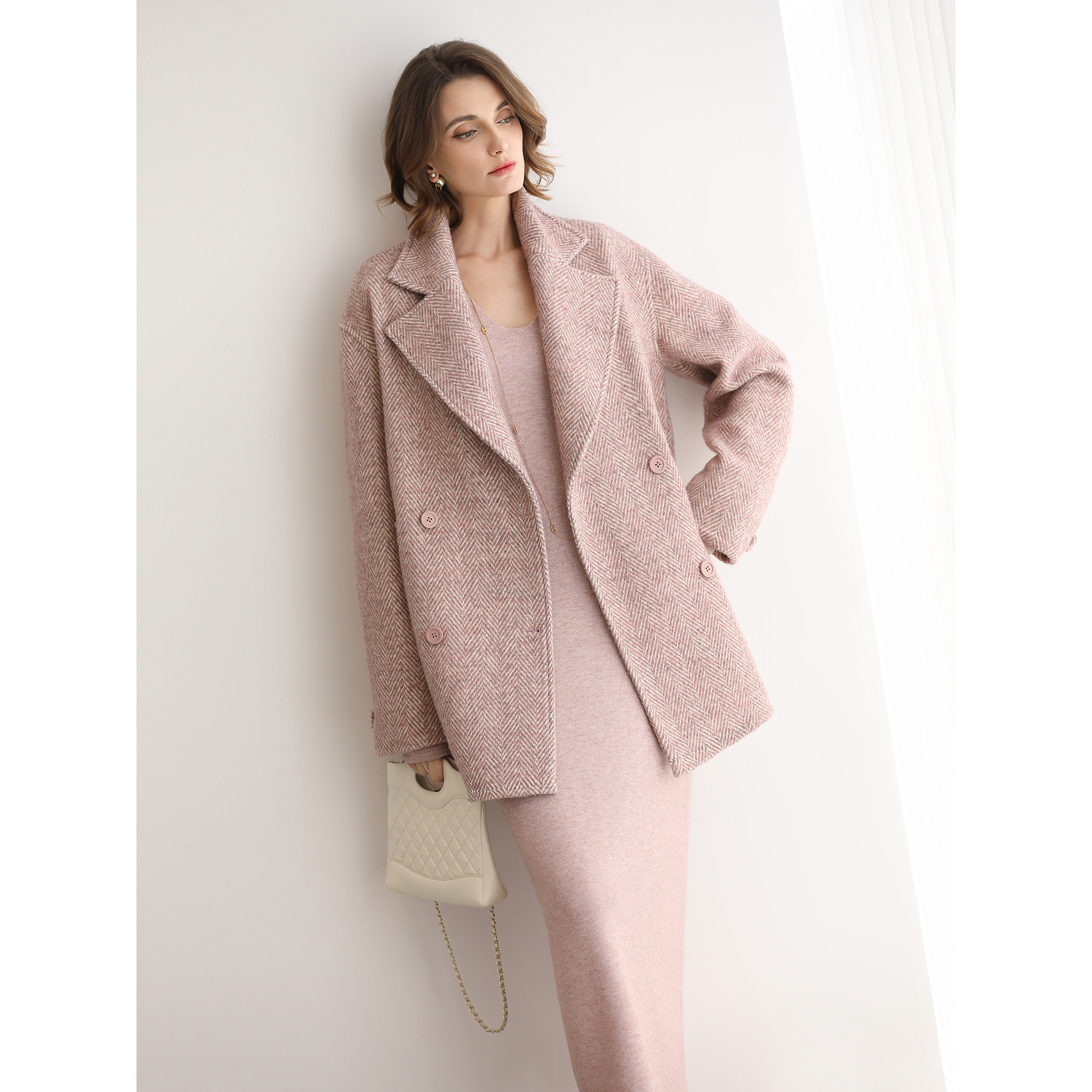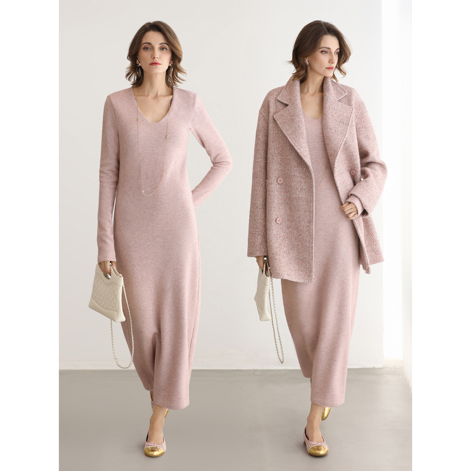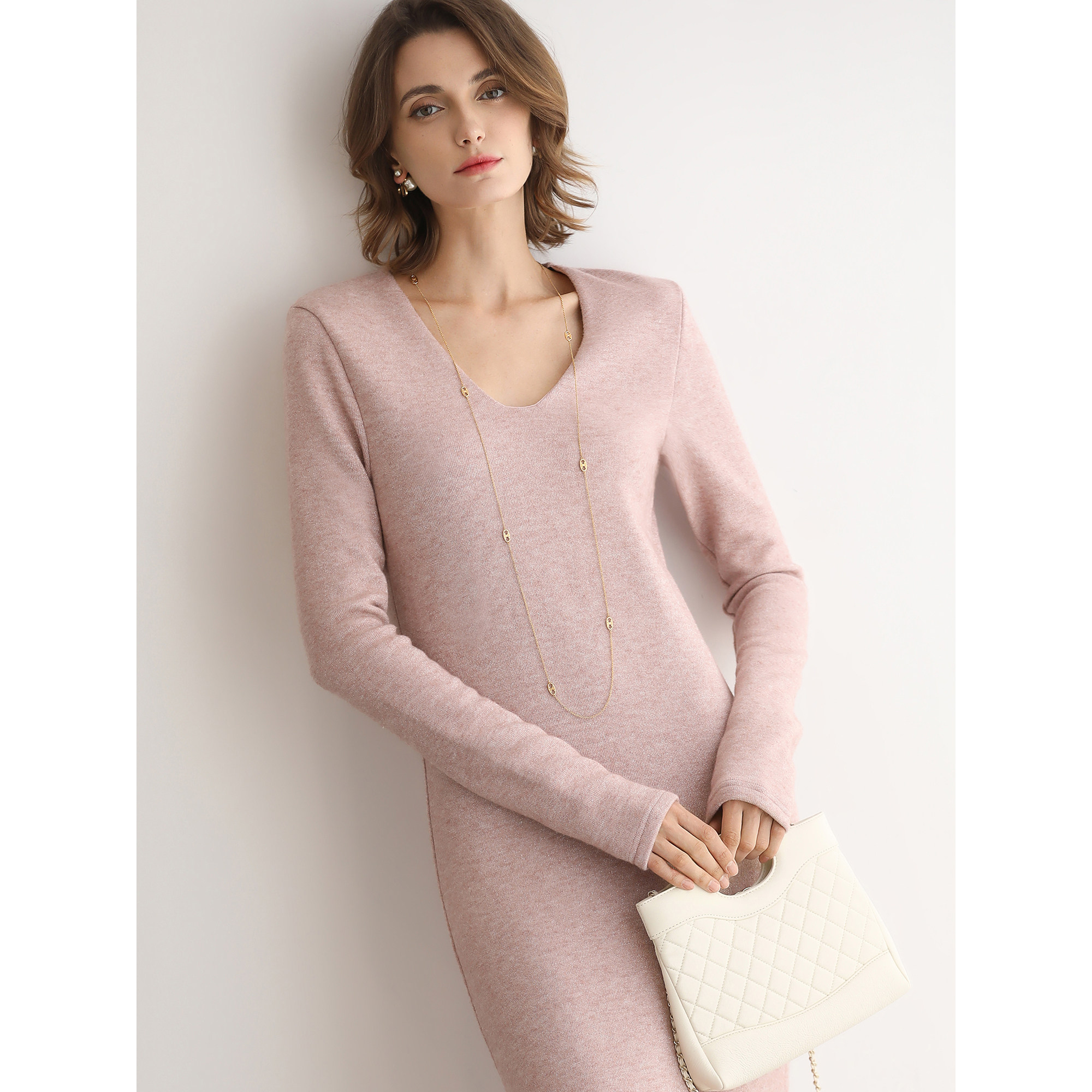 COCOBELLA气质V领粉色休闲连衣裙25女秋冬通勤针织长裙FR3242 - cocobella官方旗舰