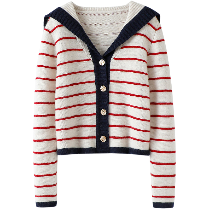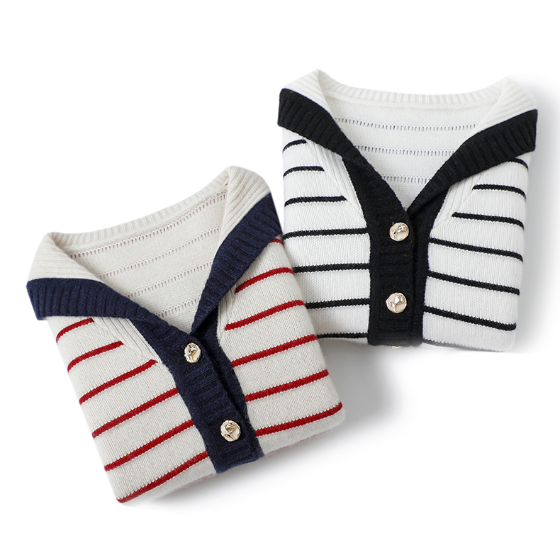 您的位置:他他商城  >   >  气质狂加分~2023新品海军领条纹V领短款纯山羊绒针织开衫外套女厚