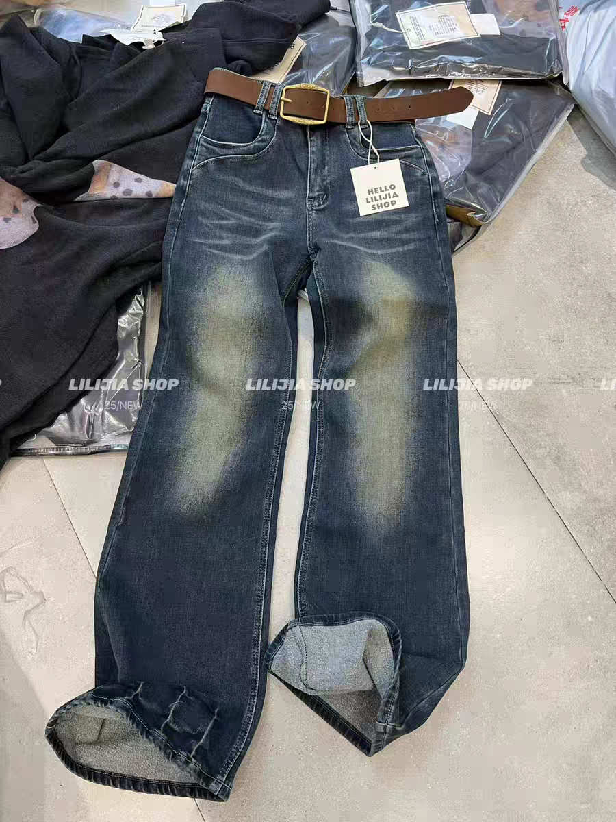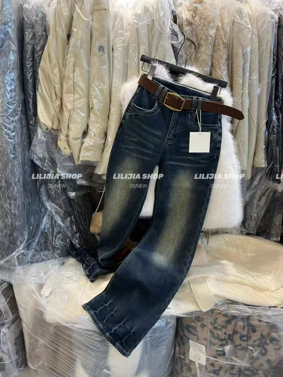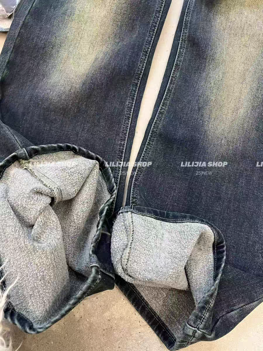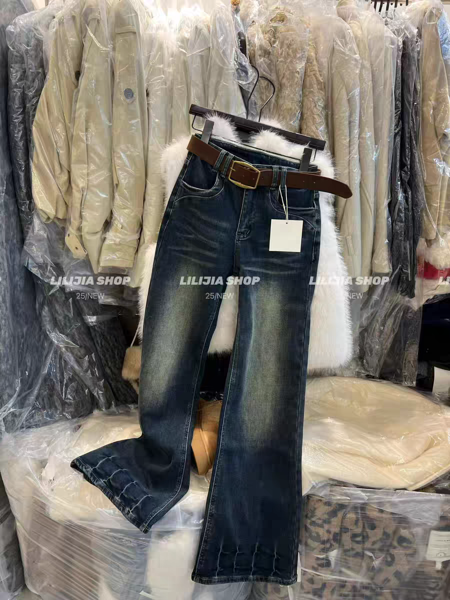 MH家 复古微喇叭牛仔裤女2025冬季小个子美式猫须抓绒微喇叭裤 - MOMO SHOP