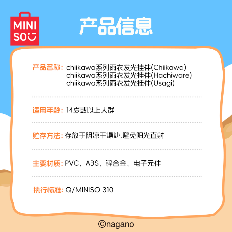 您的位置:他他商城  >   >  MINISO名创优品吉伊卡哇chiikawa系列雨衣发光挂件公仔乌萨奇小八