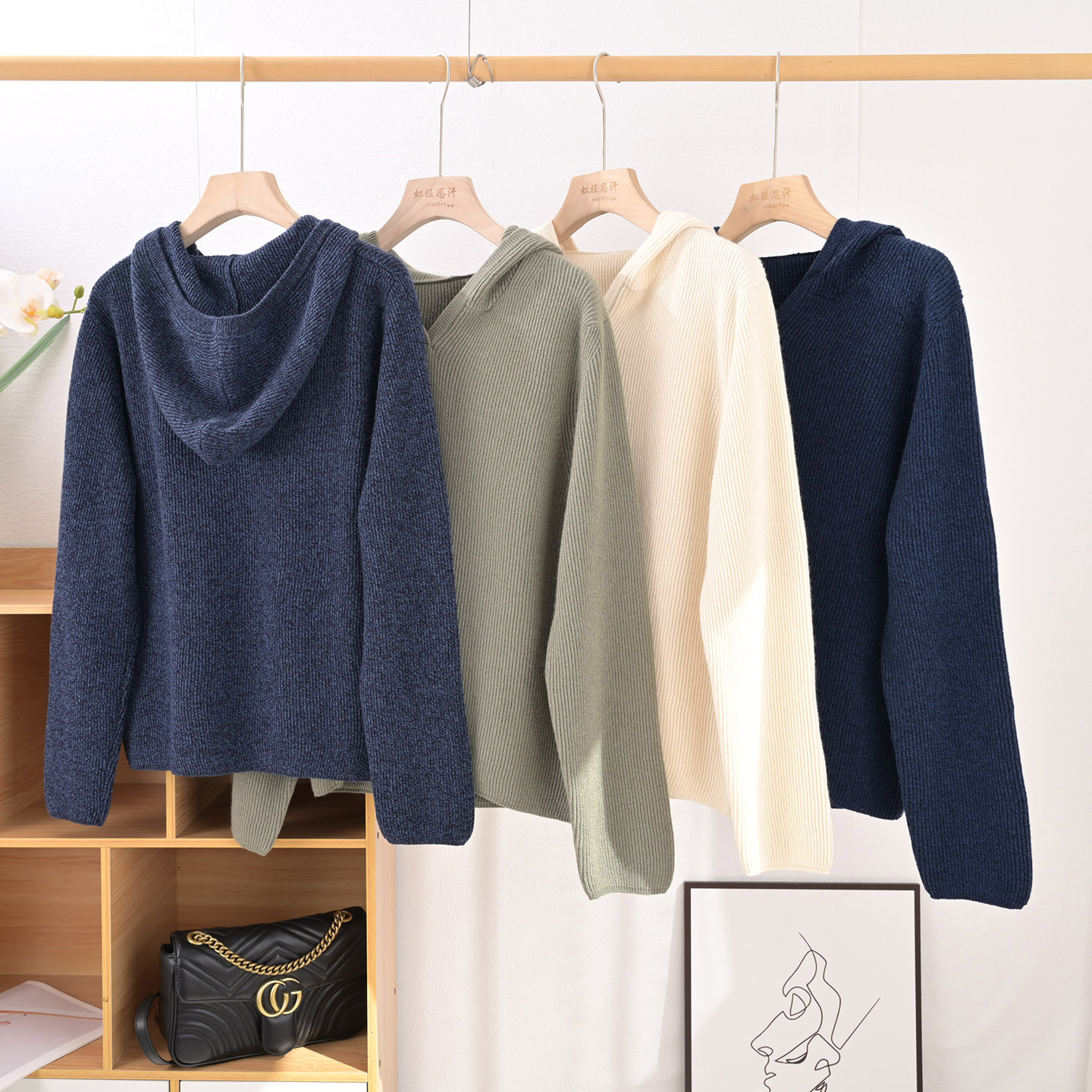 休闲慵懒风 文艺范宽松连帽衫70山羊绒+羊毛双元宝针织套衫长袖女 - 虹旺思汗羊绒高端定做
