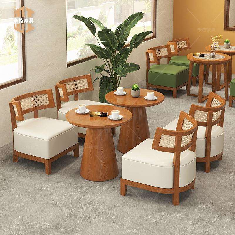 您的位置:他他商城  >   >  咖啡店洽谈桌椅组合设计师奶茶店编藤实木皮艺椅子甜品店休闲桌椅