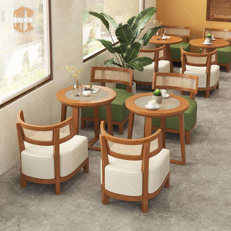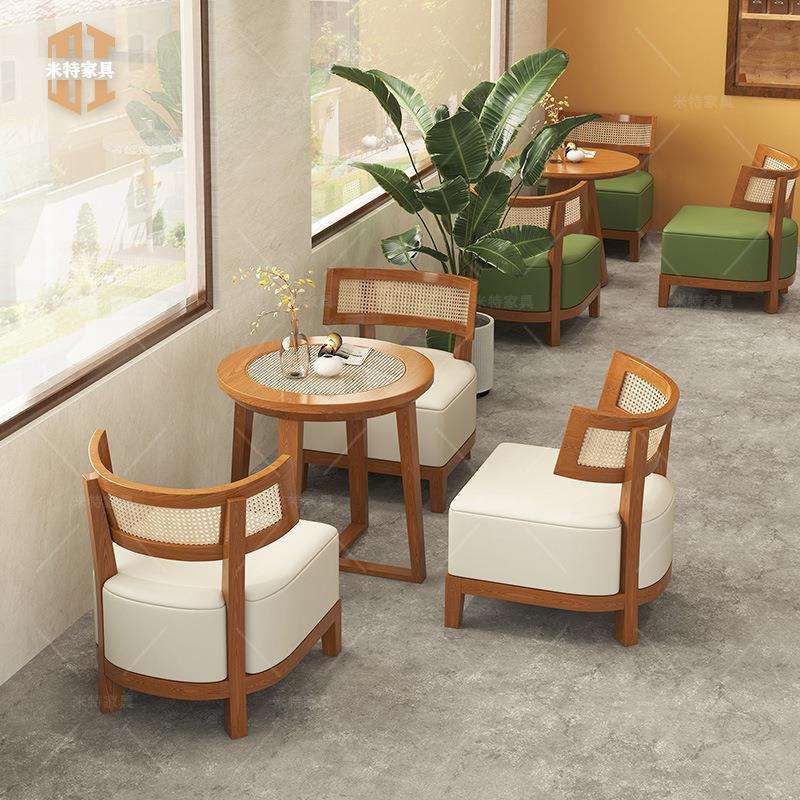 咖啡店洽谈桌椅组合设计师奶茶店编藤实木皮艺椅子甜品店休闲桌椅