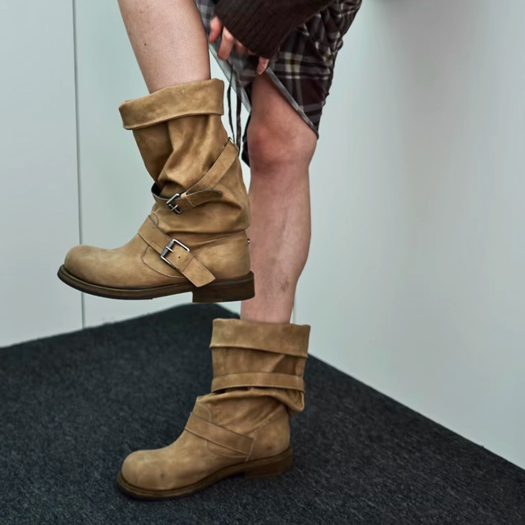 张元英同款皮带扣堆堆靴粗跟复古做旧中筒靴韩版靴子小众工装靴女 - 卖女鞋的凯哥