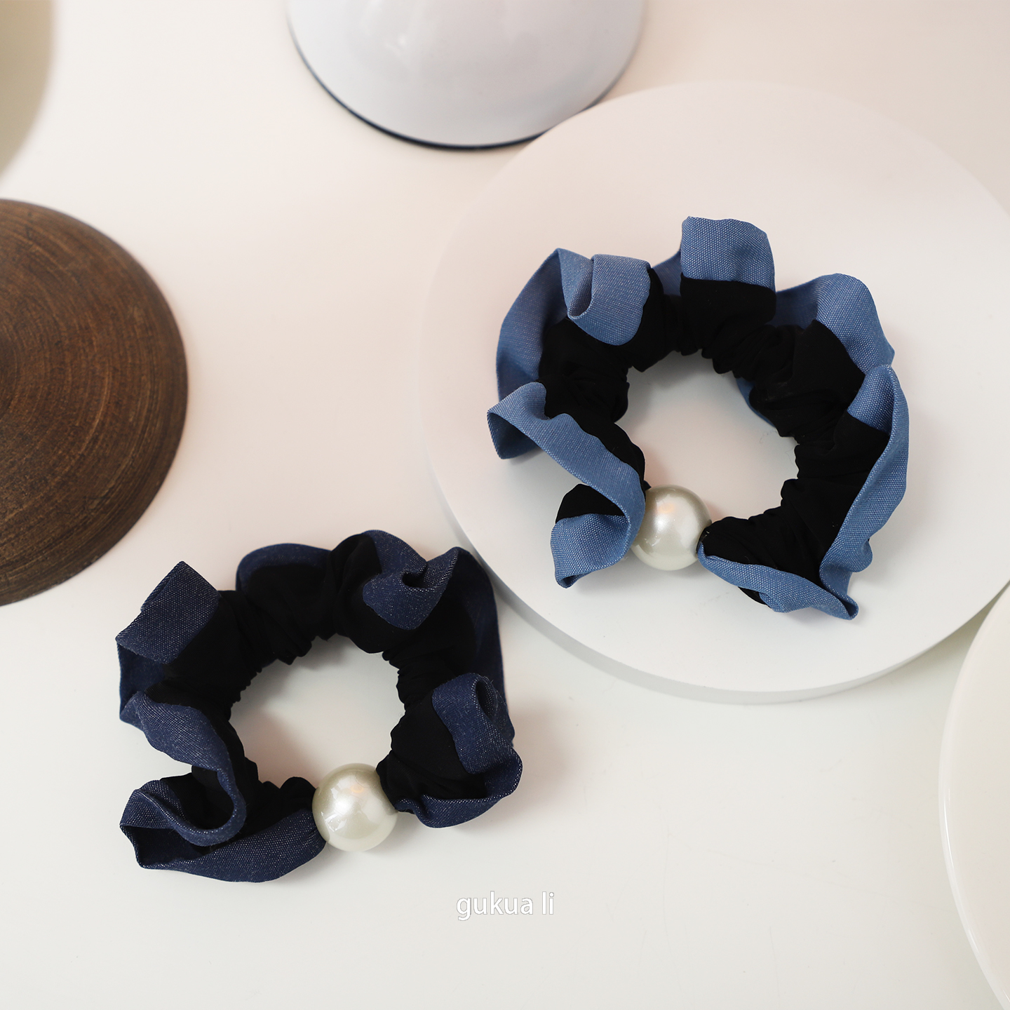 GUKUALI圆珠牛仔布艺大肠发圈头绳头饰简约百搭皮筋丸子头大肠圈 - GUKUA LI 小姐设计品牌