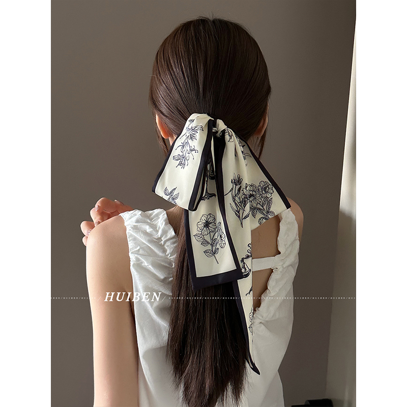 新中式印花蝴蝶结飘带发圈法式低马尾皮筋高级感复古缎面碎花发绳 - HUI本慧