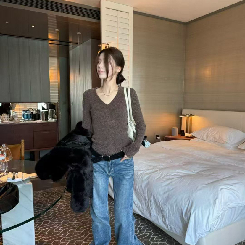 IU ROOM 韩系简约高级修身弹力显瘦V领针织打底衣抗起球毛衣3825 - 十三行女装IU ROOM