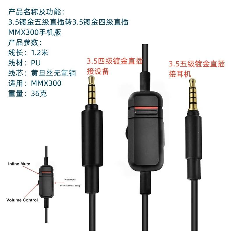适用于拜亚动力MMX300二代头戴式耳机音频线跨境音频线连接线 - 雅音3C数码配件