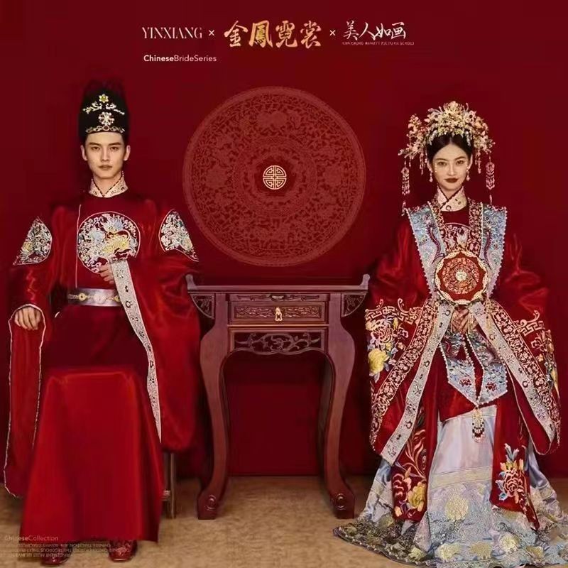 中式婚礼婚服出租明制汉服凤冠霞帔拖尾婚礼仪式走秀结婚古装嫁衣 - 汉仪天下汉服出租