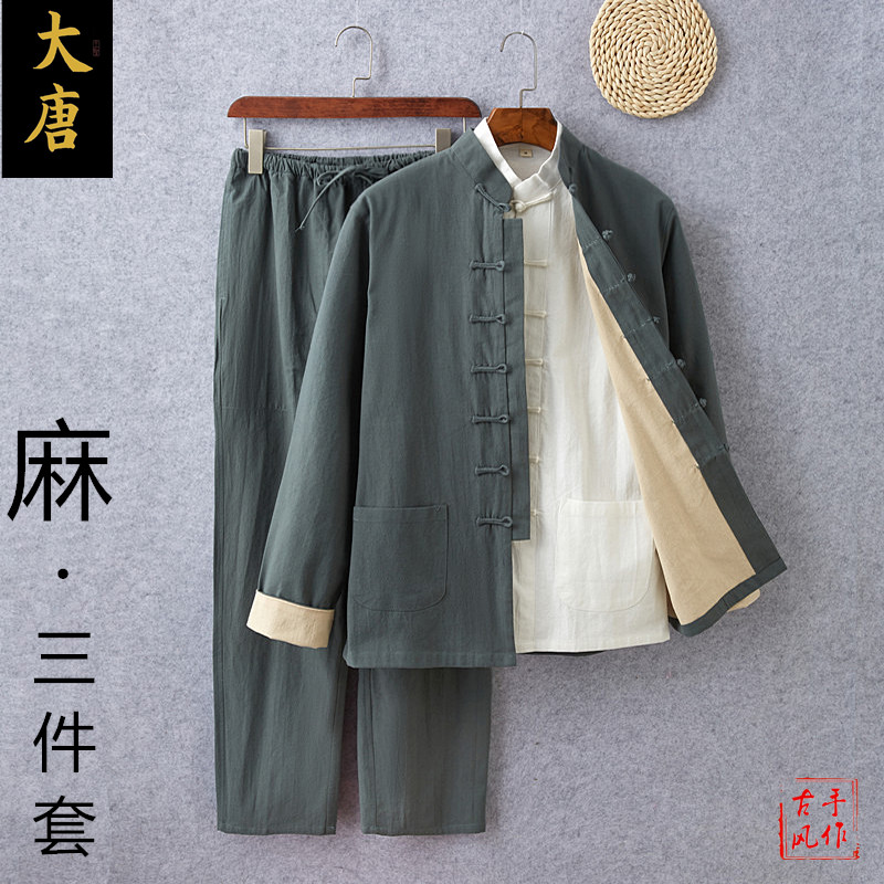 唐装男士套装春秋中国风青年复古亚麻长袖外套中式棉麻中山装汉服 - 大唐民族服饰