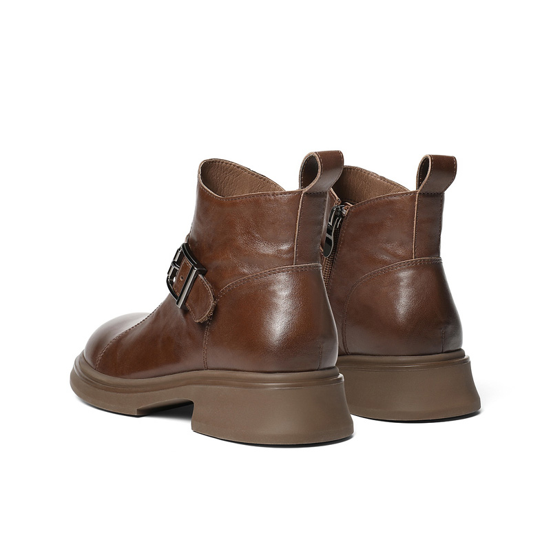 专柜正品百丽2025冬新款女靴牛皮抓皱圆头方跟休闲短筒靴E8P1DDD5 - 商场女鞋专柜正品代购