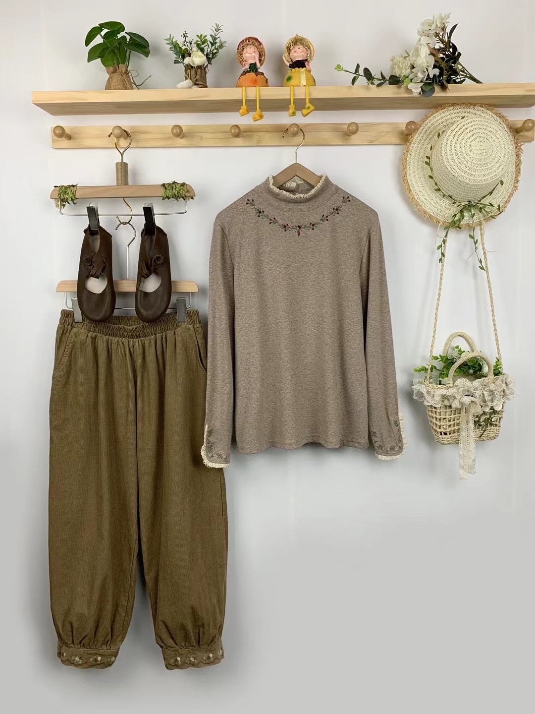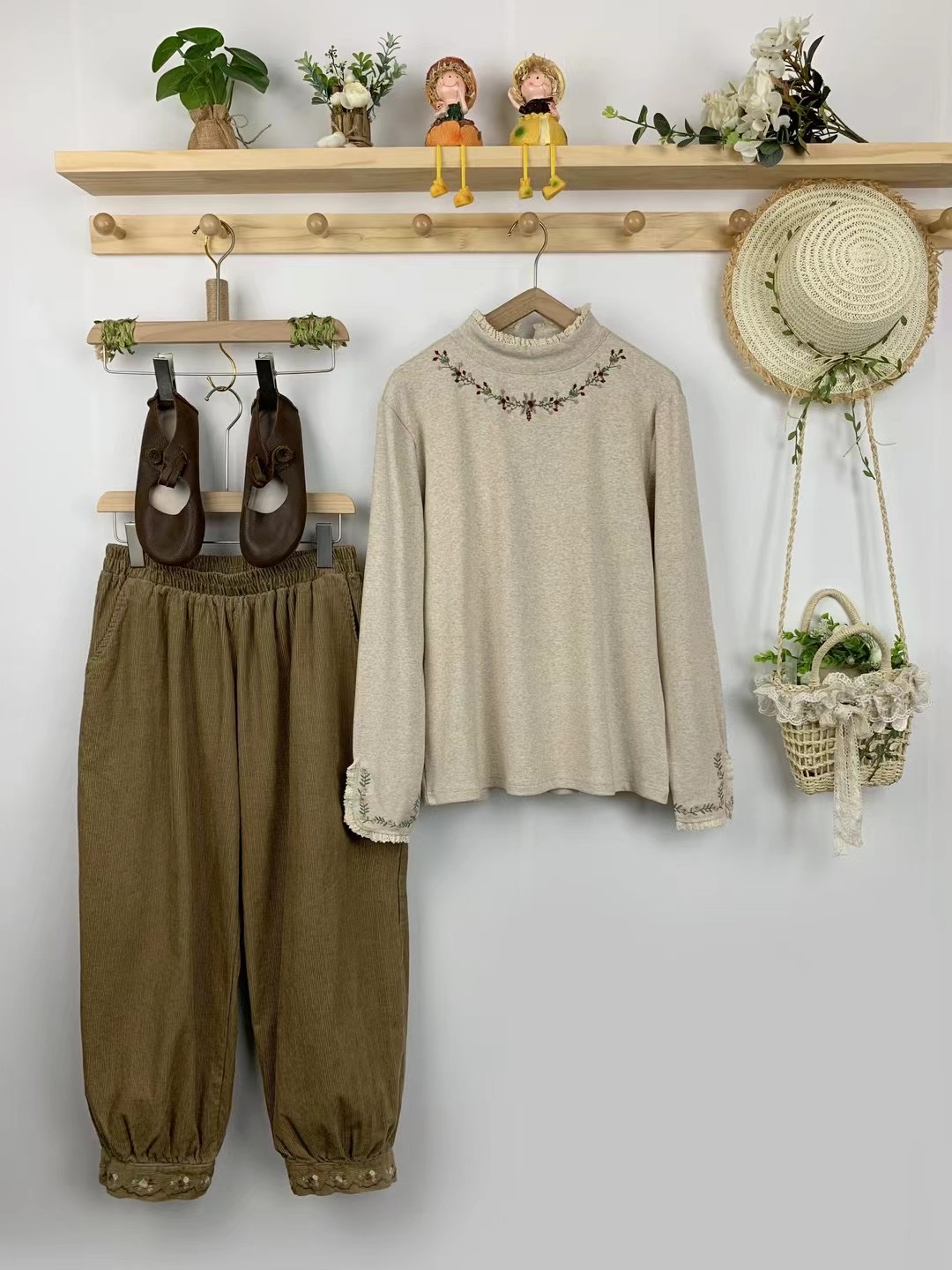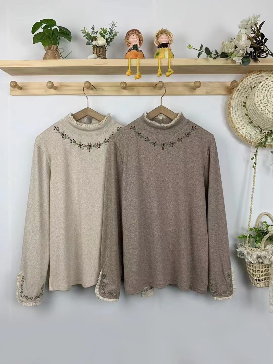日森系甜美刺绣高领弹力长袖打底衫宽松百搭棉质显瘦T恤内搭上衣 - 茉莉花开了 森系文艺女装