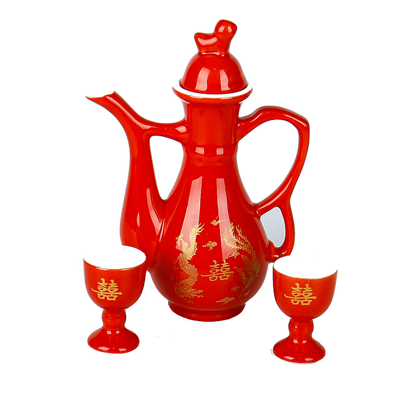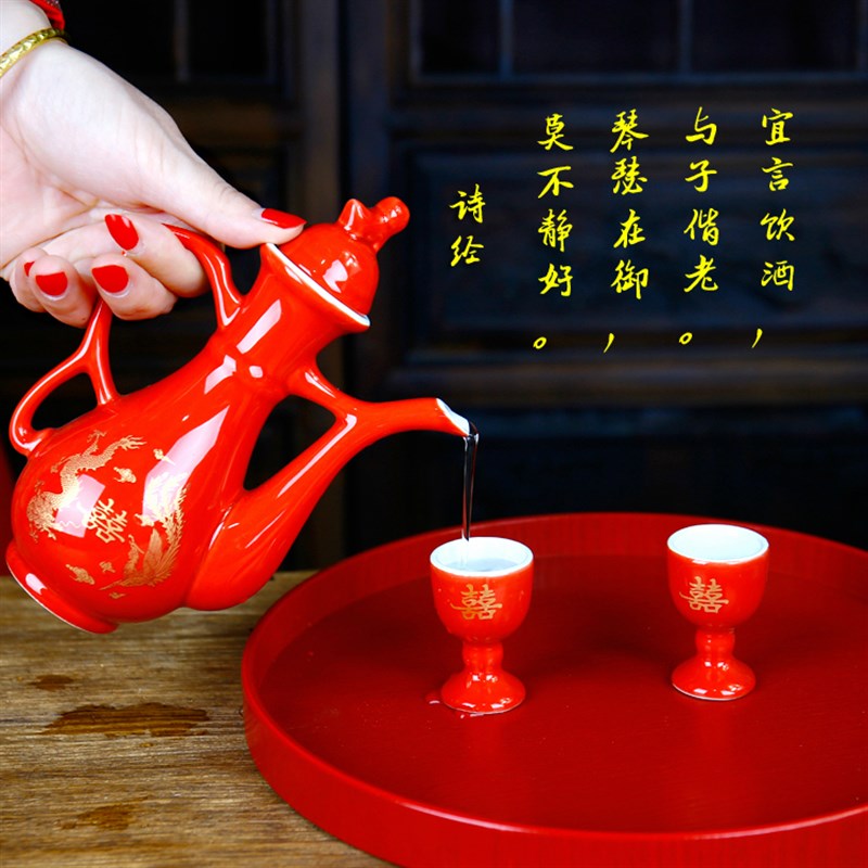 结婚婚庆用品红色敬酒杯中式婚礼龙凤喜字酒壶套装新娘嫁妆交杯酒 - 江海优品