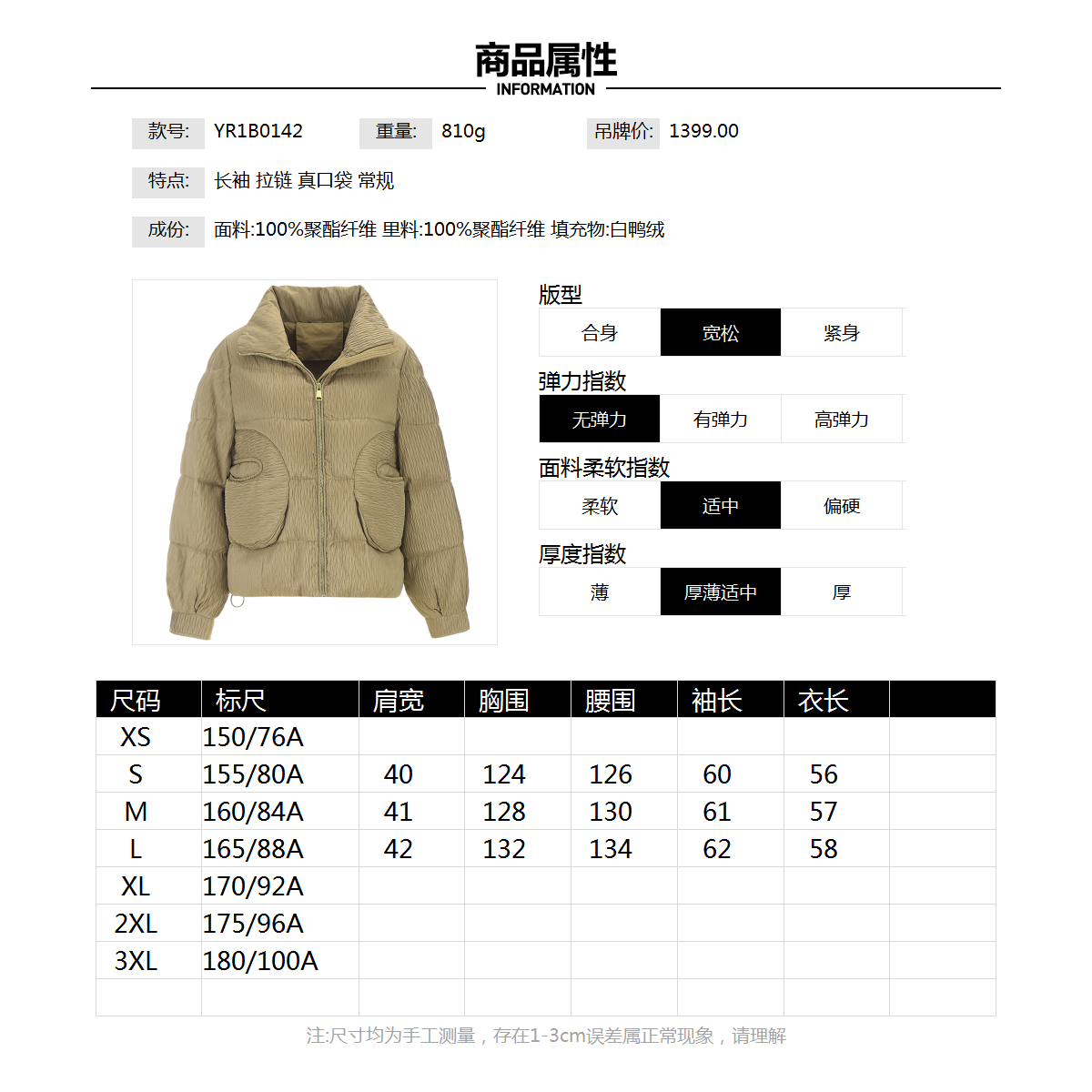 YR1B0142宽松轻柔长袖外套白鸭绒羽绒服女11.26冬