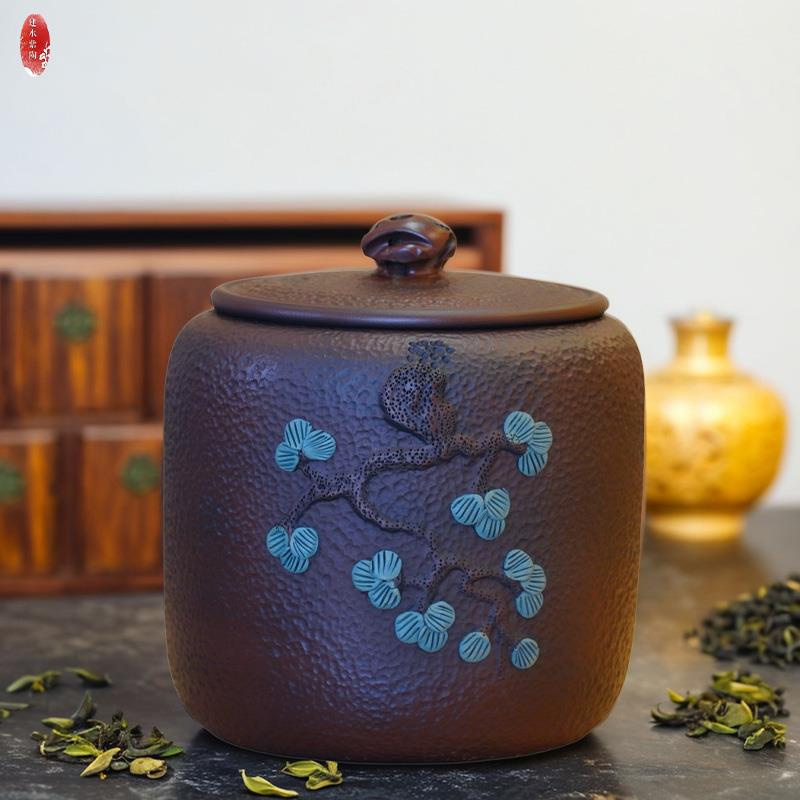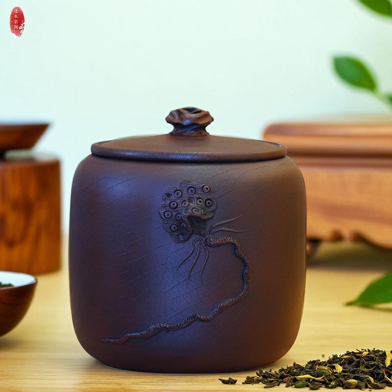 云南建水紫陶茶叶罐普洱茶储茶罐浮雕纯手工密封陶瓷高档全手微瑕 - 吉祥如意3企业店