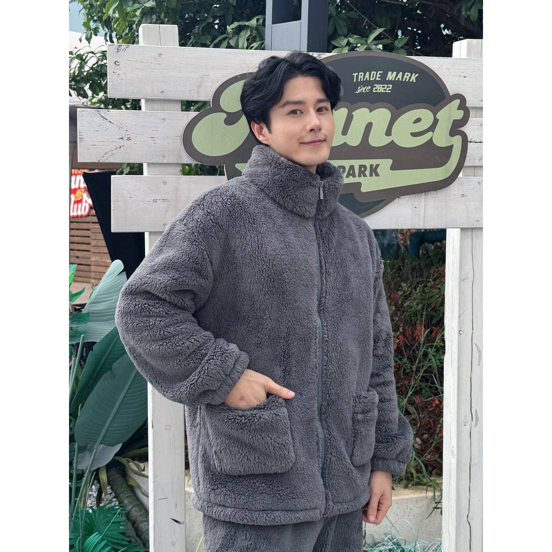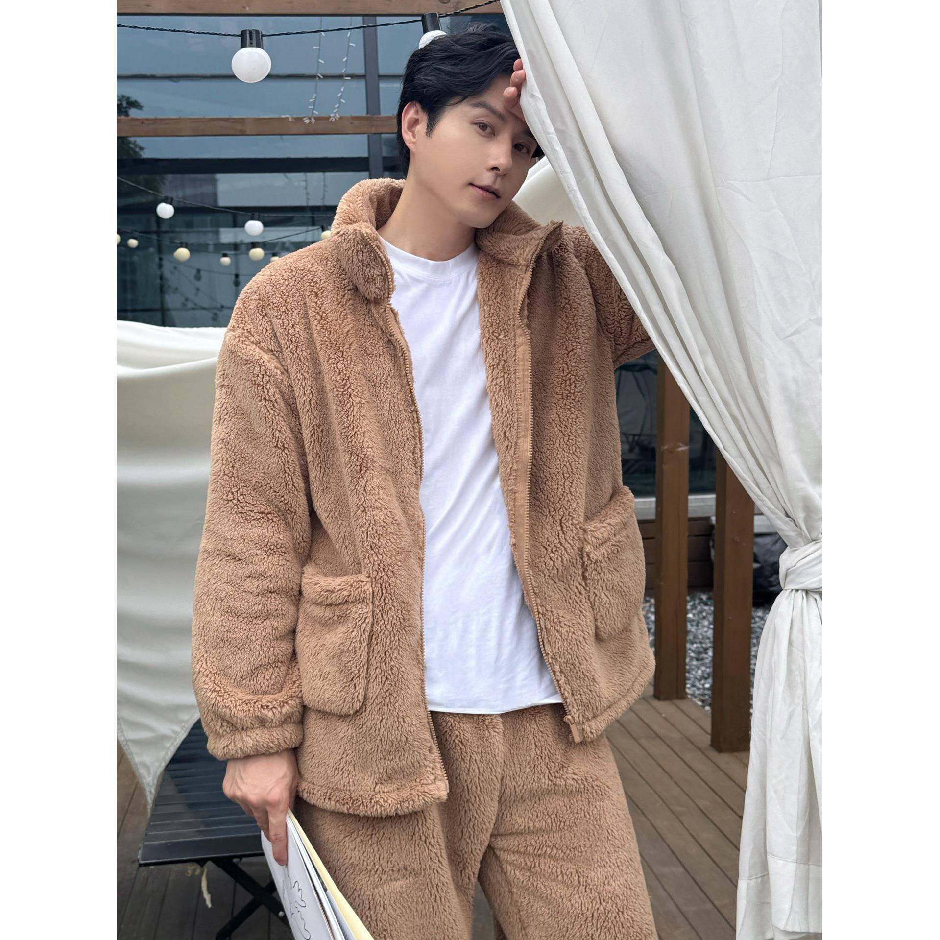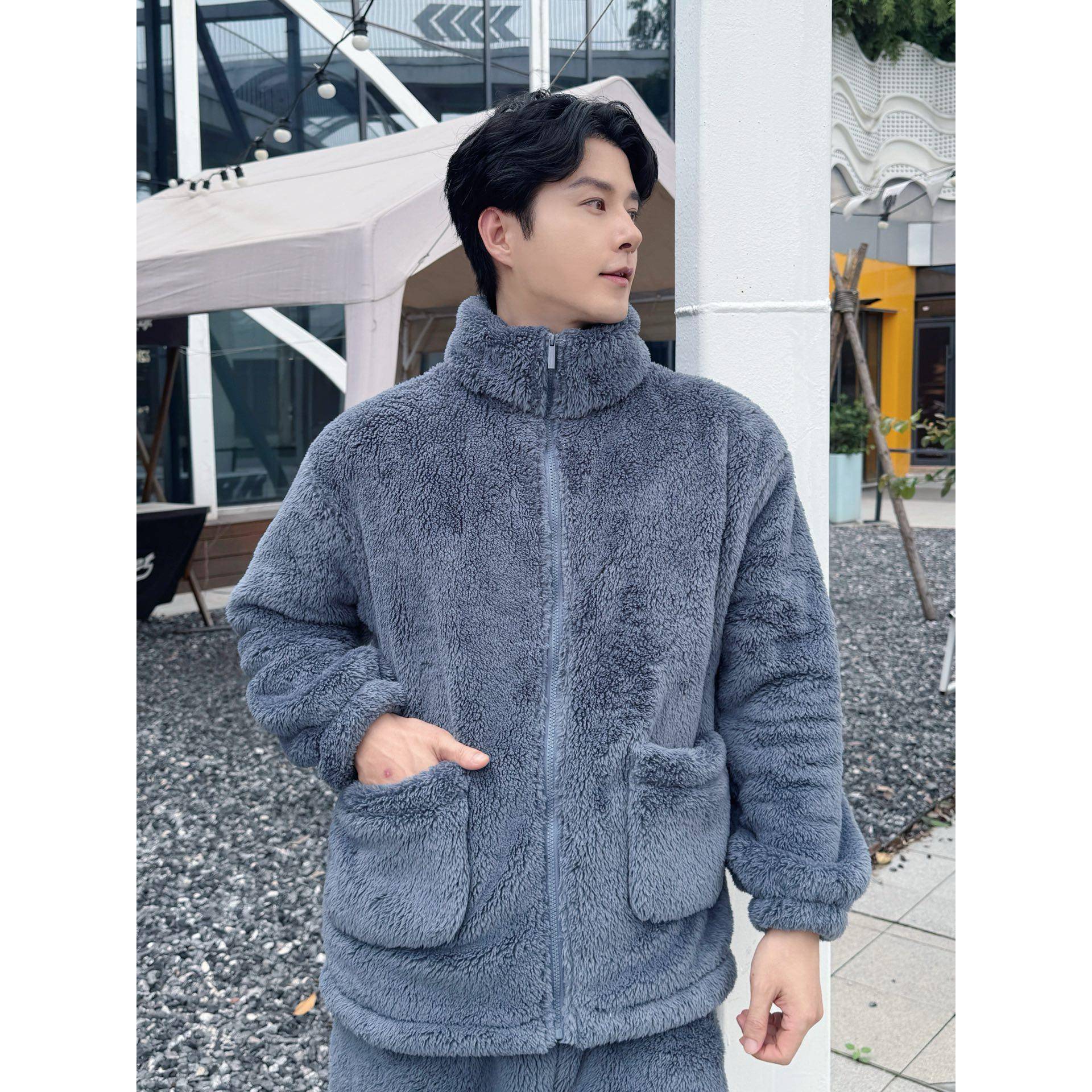韩版潮流男士立领拉链北极绒睡衣冬季休闲外穿加绒加厚保暖家居服 - 韩拰家代购店