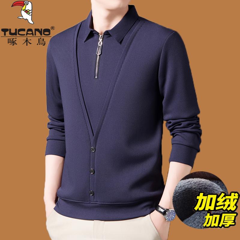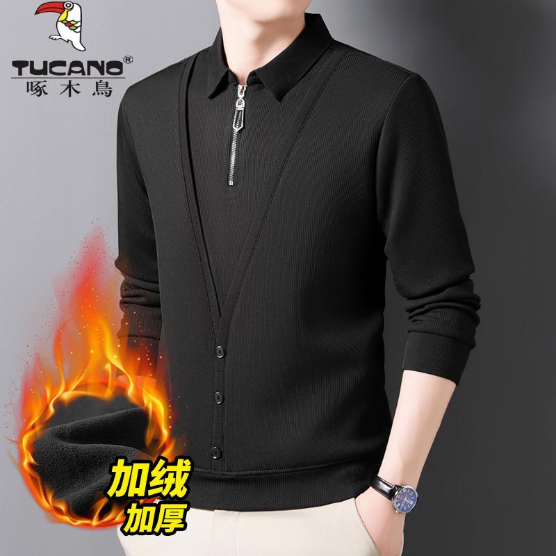 啄木鸟新款半拉链翻领毛衣男加绒加厚开衫假两件针织羊毛衫爸爸装 - 啄木鸟正品精品服饰男装