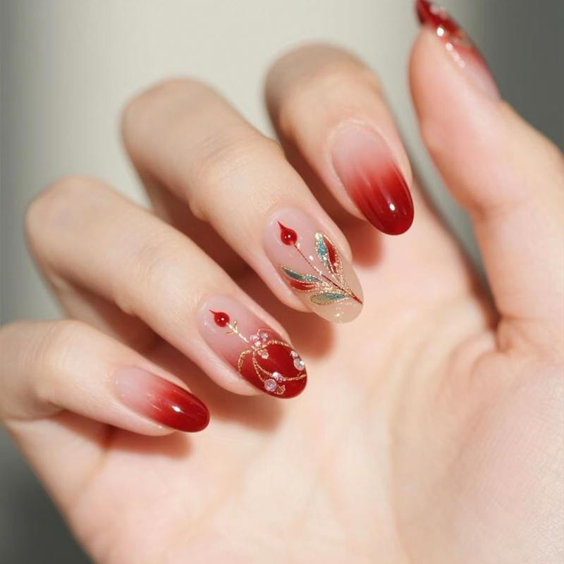 秋季新款精致国风红色相思红豆纯手绘刺绣国潮美甲手工定制穿戴甲