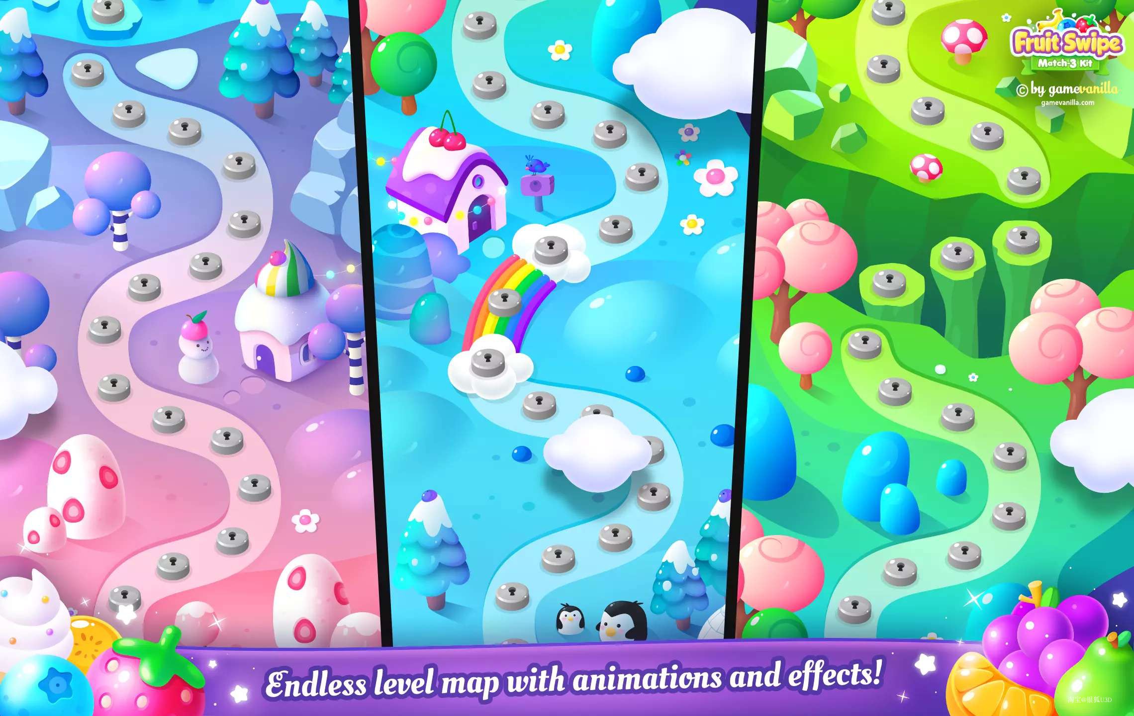 U3D水果消除小游戏项目源码编辑器 Fruit Swipe Match 3 Kit v2.2 - 银狐资源工作室