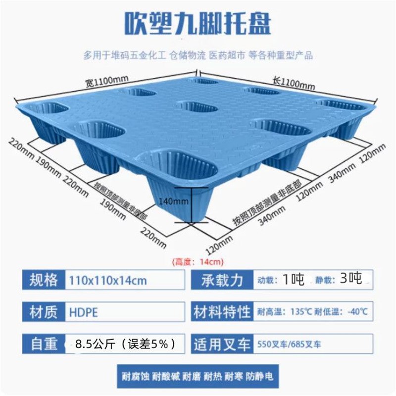 您的位置:他他商城  >   >  九脚吹塑托盘塑料卡板仓库垫板防潮板叉车地推物流W栈板仓储加厚