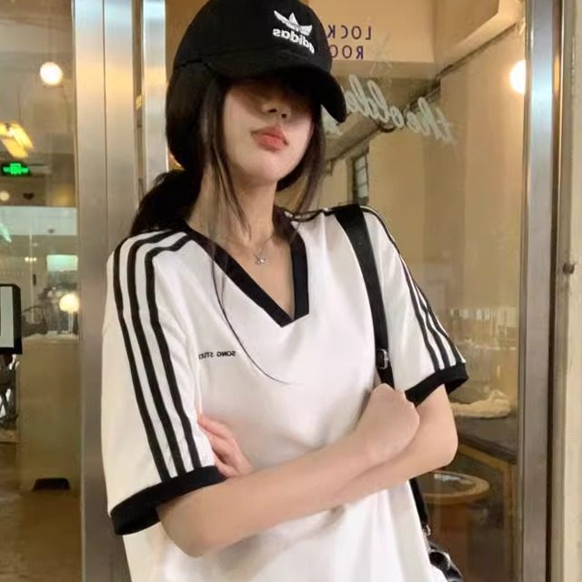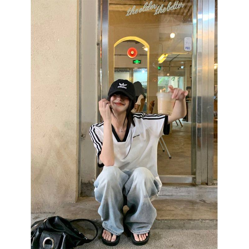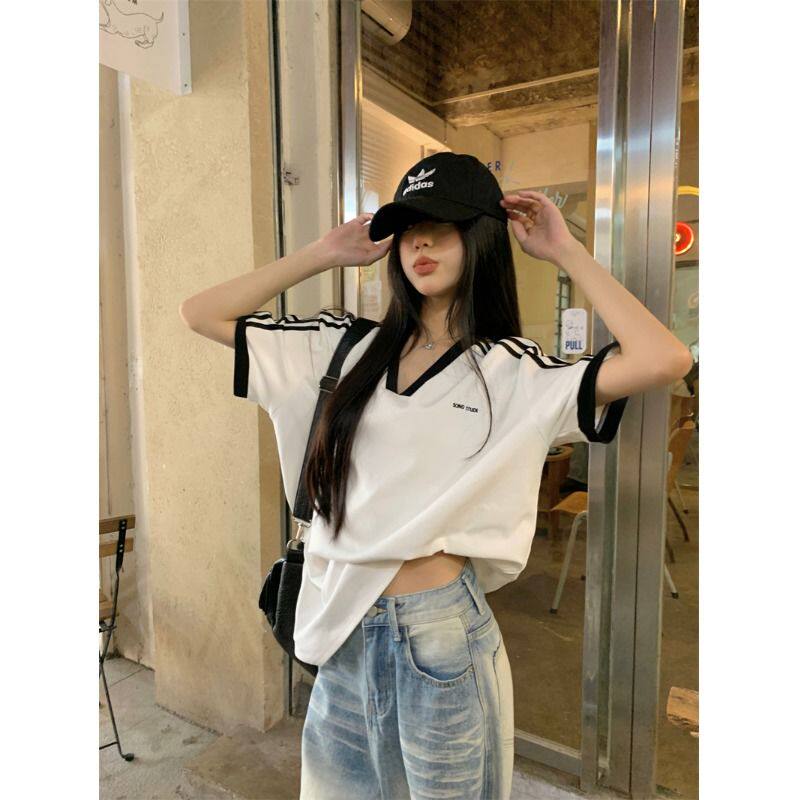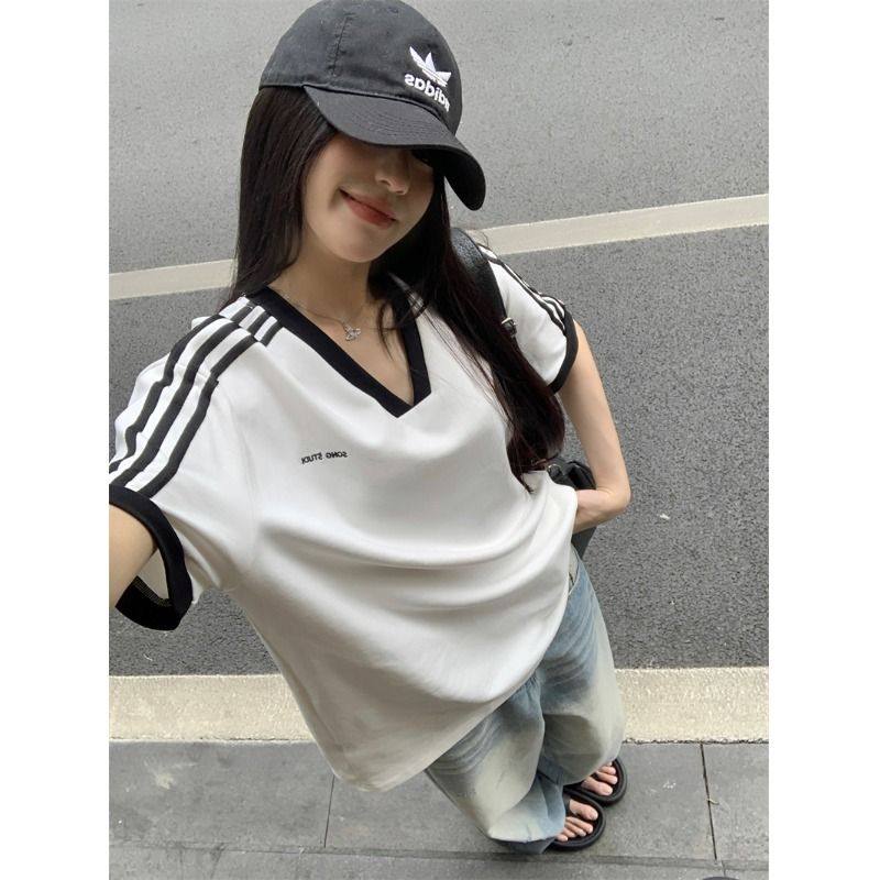 2025年夏季简约宽松显瘦休闲百搭上衣学生撞色V领条纹短袖T恤衫女 - 可可粉丝专享店铺